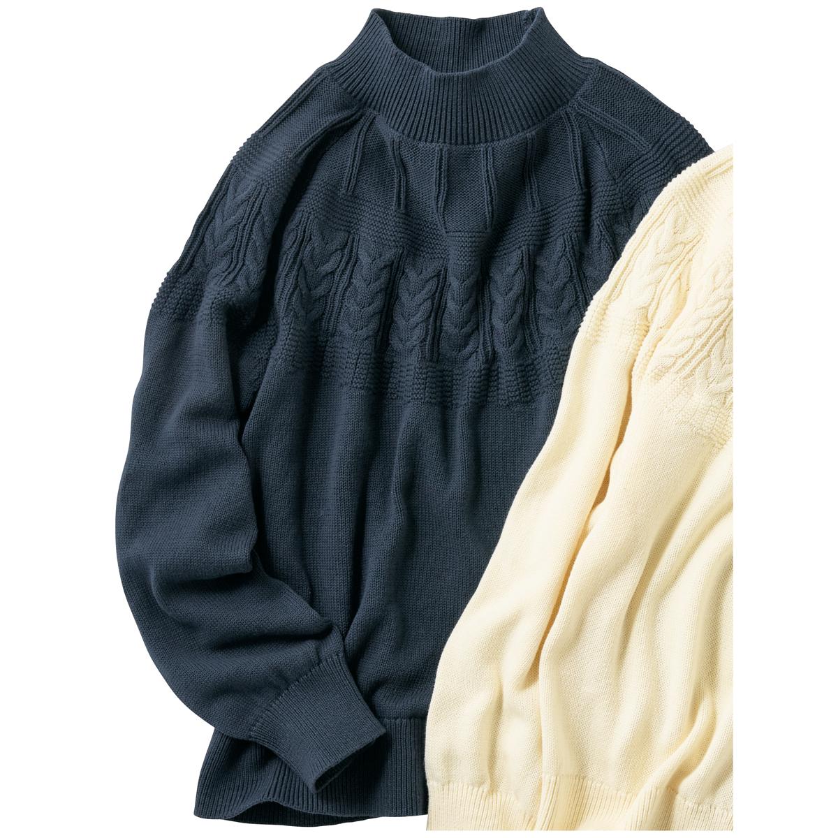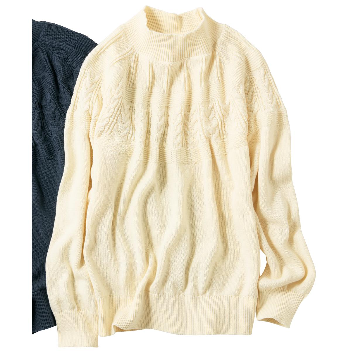 春先まで着られる綿100%ニットで、程よいフィット感も快適。首元をカバーするプチハイネックでひんやりもおさえます。