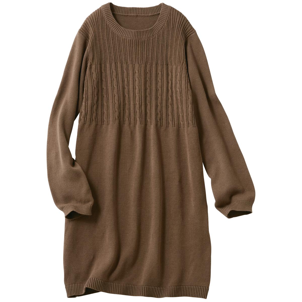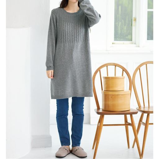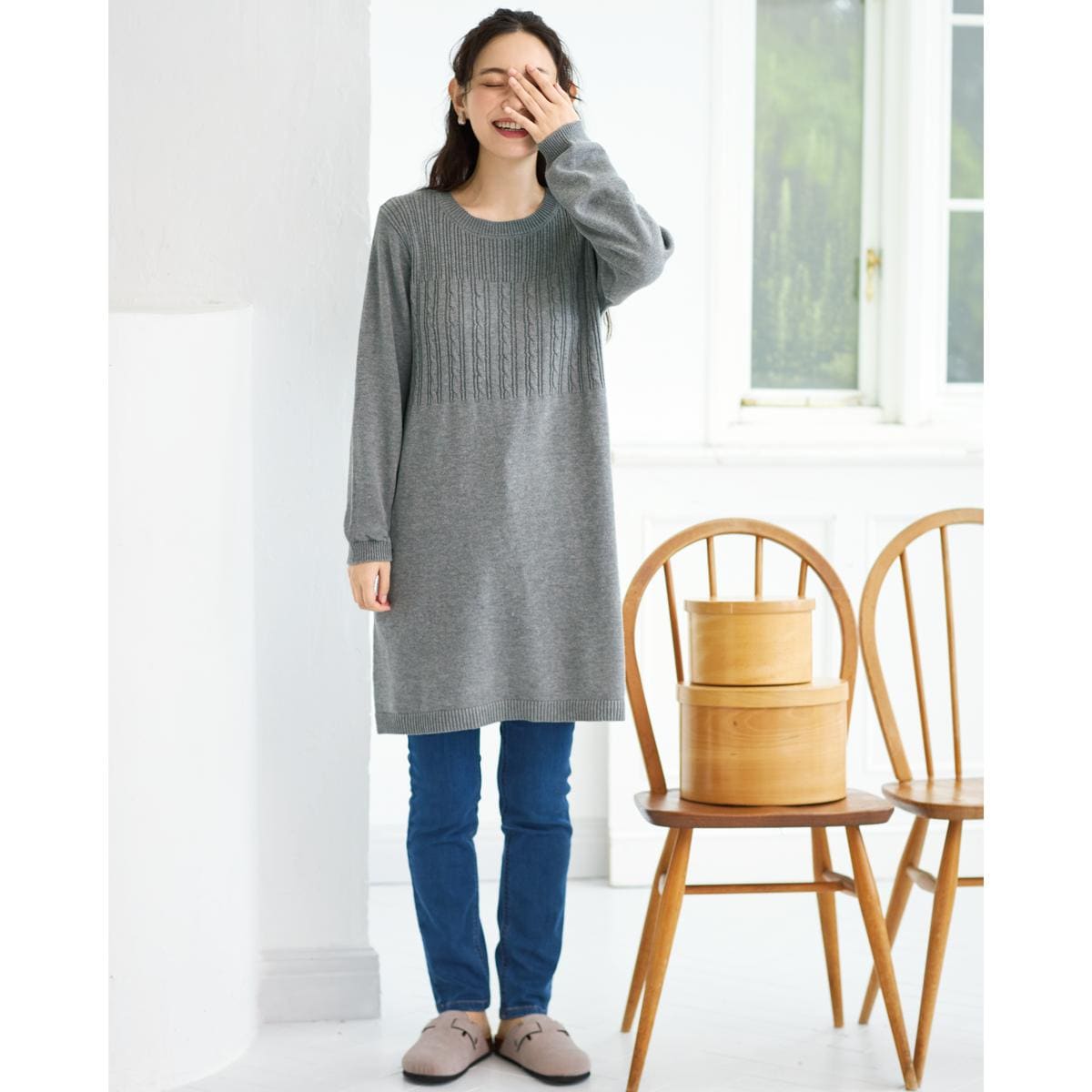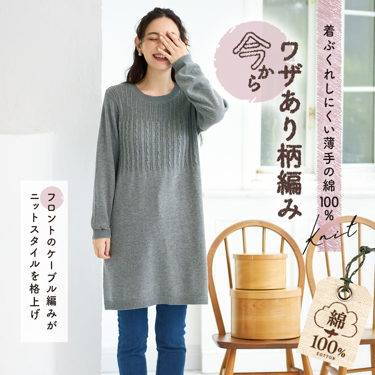 -お買い得ポイント-太ももまで隠せるチュニック丈が、スキニーやワイドパンツと好相性です。ふわりとあったか立ち姿もいい感じ♪-デザイン-胸元からウエストまでの編み地がメリハリのある着こなしに◎。ふんわりした袖先と、少しのAラインシルエットで程よくゆったり着られます。-素材特徴-優しい肌あたりの綿100%ニット。着ぶくれしにくい薄手の素材なので1枚でも、重ね着でも長く着られます。