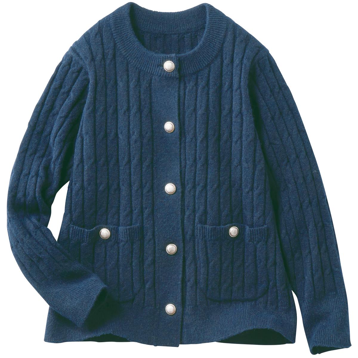 ケーブル編みとボタンがアクセント 立体感のある編み地とメタルボタンがきちんとキレイ見え。圧縮ウールのような暖かさです。