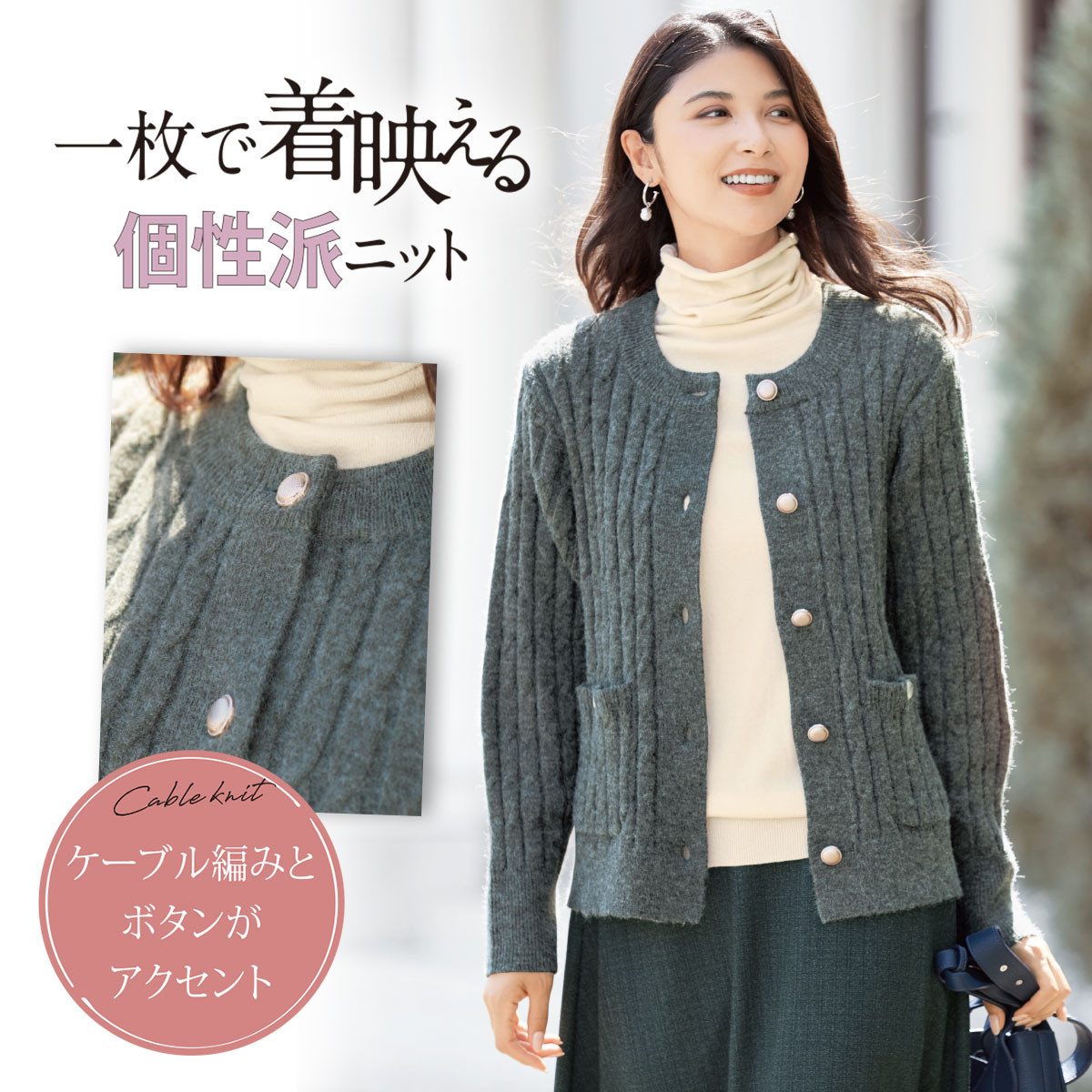 ケーブル編みと華やかな印象のボタンがアクセント。一枚で着映える個性派ニット。
