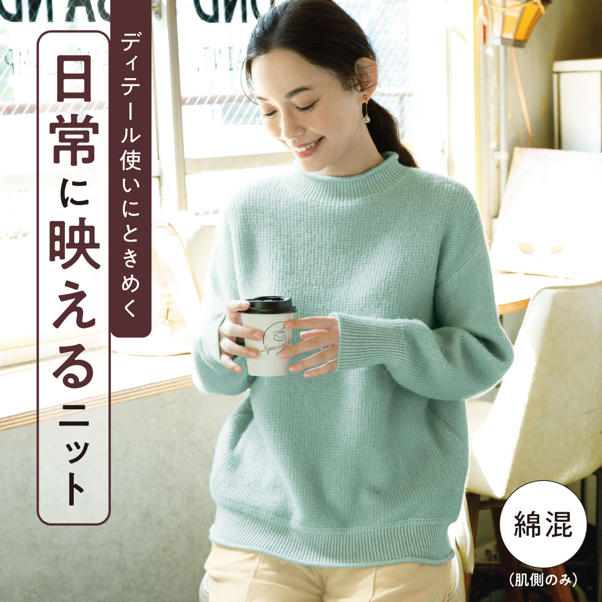 -お買い得ポイント-ふんわりやさしい着心地豊かな表情を生み出す、表裏の異なる糸使いが特徴です。ドロップショルダーなので動きやすく、オシャレな印象を演出♪優しい色のポイント!-デザイン-衿元と裾のロールアップがアクセントの着回しやすいシンプルデザイン。ふんわり毛足のある表面感がナチュラルな着こなしにぴったりです。-素材特徴-肌側は綿混素材で心地良く、やさしい肌あたりです。洗濯機もOKで安心のニットです。