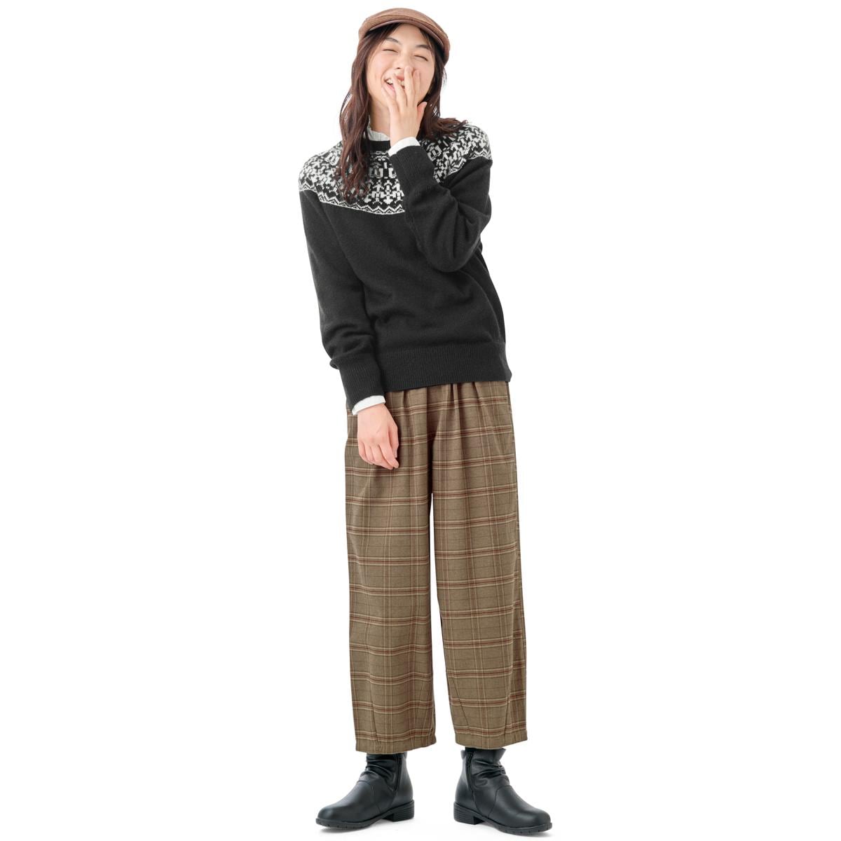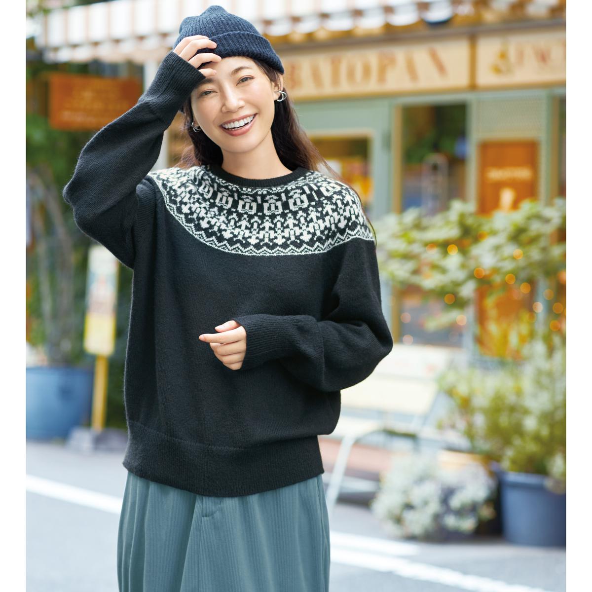微起毛のふんわりした風合いに心満たされるニット。大人のカジュアルスタイルに相応しい、シックな柄と配色が魅力です。