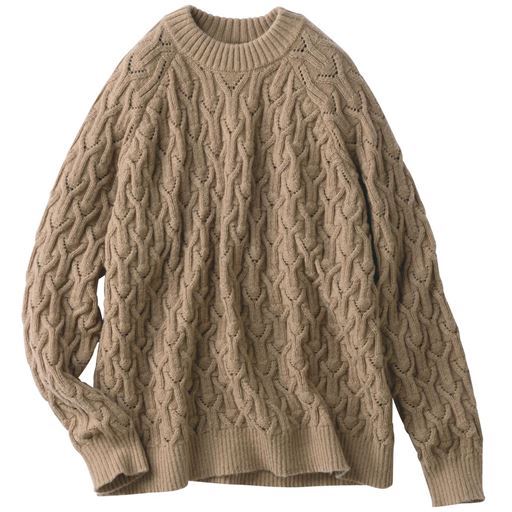 軽い着心地の透かし編み ざっくりした透かし編みの立体感が個性的なニットです。肩から腕が動かしやすく、ラフに着られるラグランスリーブが嬉しい。