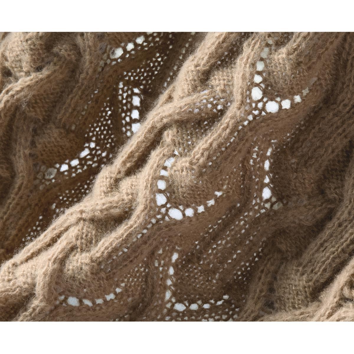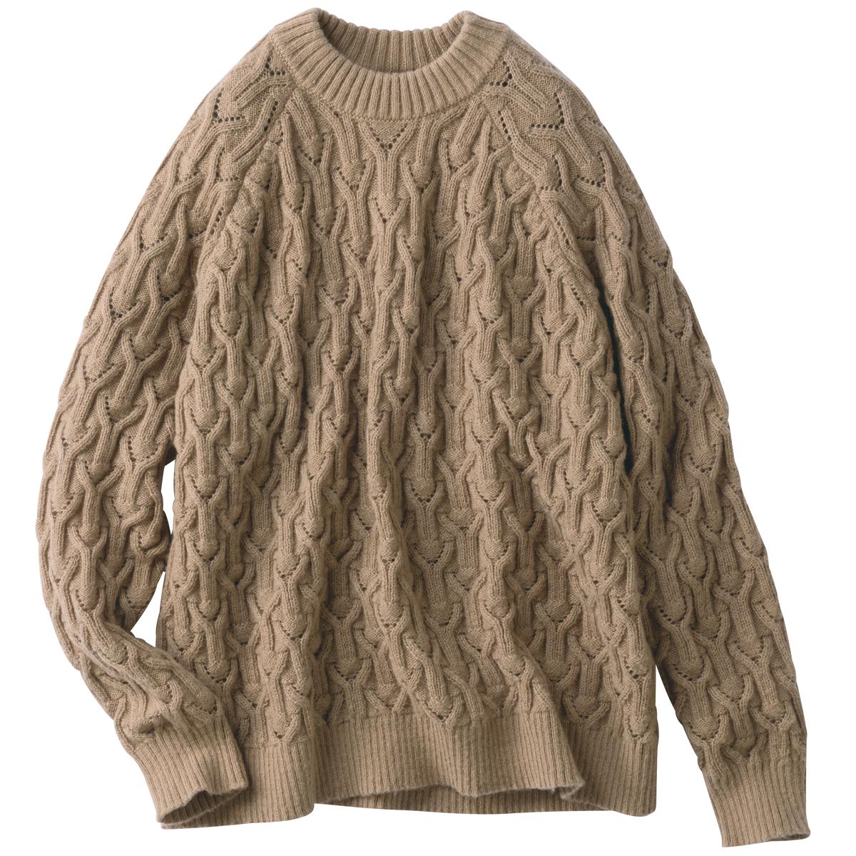 軽い着心地の透かし編み ざっくりした透かし編みの立体感が個性的なニットです。肩から腕が動かしやすく、ラフに着られるラグランスリーブが嬉しい。