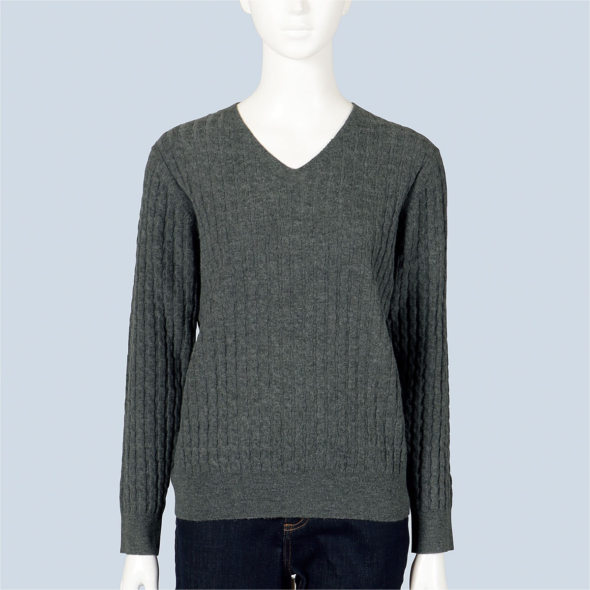 浅めのVネックが顔まわりをすっきりとした印象に。縦方向のケーブル柄で上半身をすらっと見せてくれます。