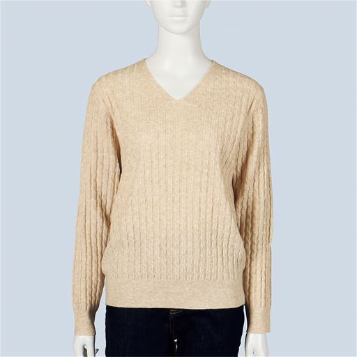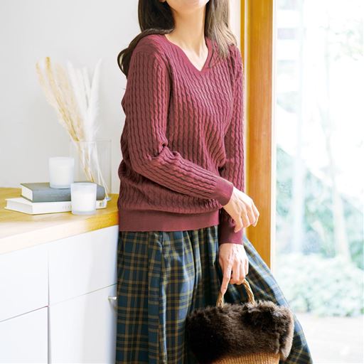 -お買い得ポイント-1枚で着映える表情豊かなケーブル編み。ふっくらやわらかな着心地が魅力です。-デザイン-浅めのVネックが顔まわりをすっきりとした印象に。縦方向のケーブル柄で上半身をすらっと見せてくれます。-素材特徴-洗濯機で丸洗いOKのお手軽ニットです。