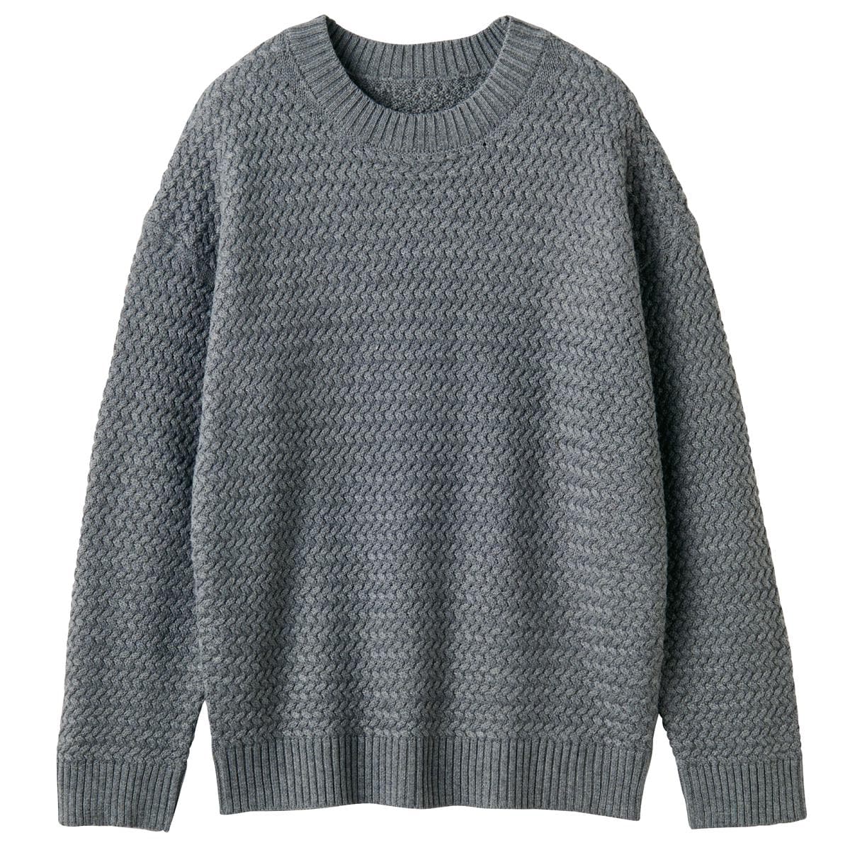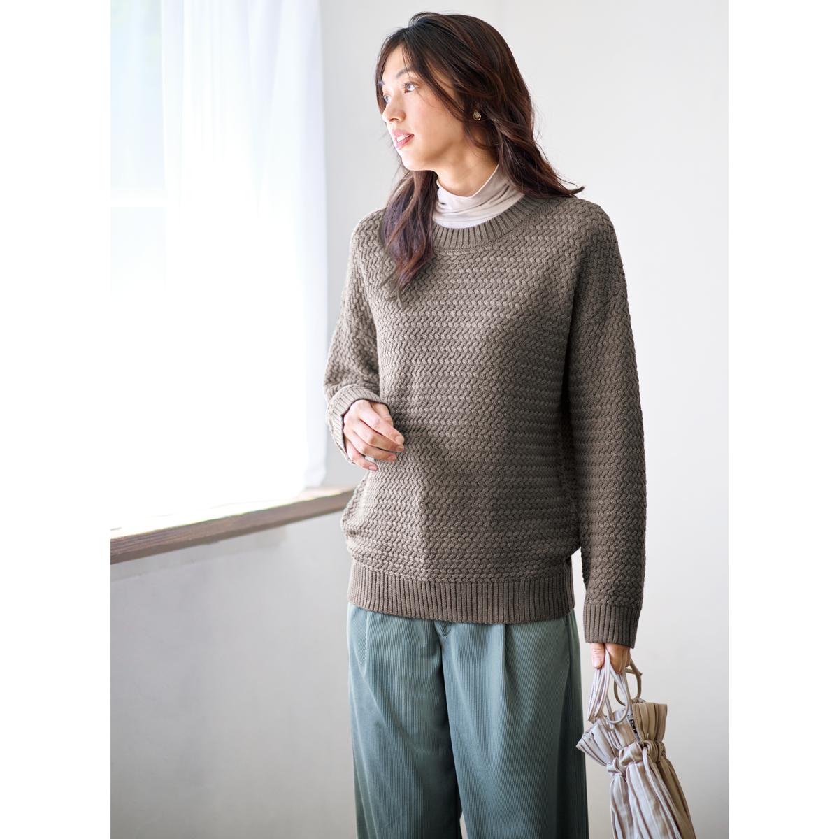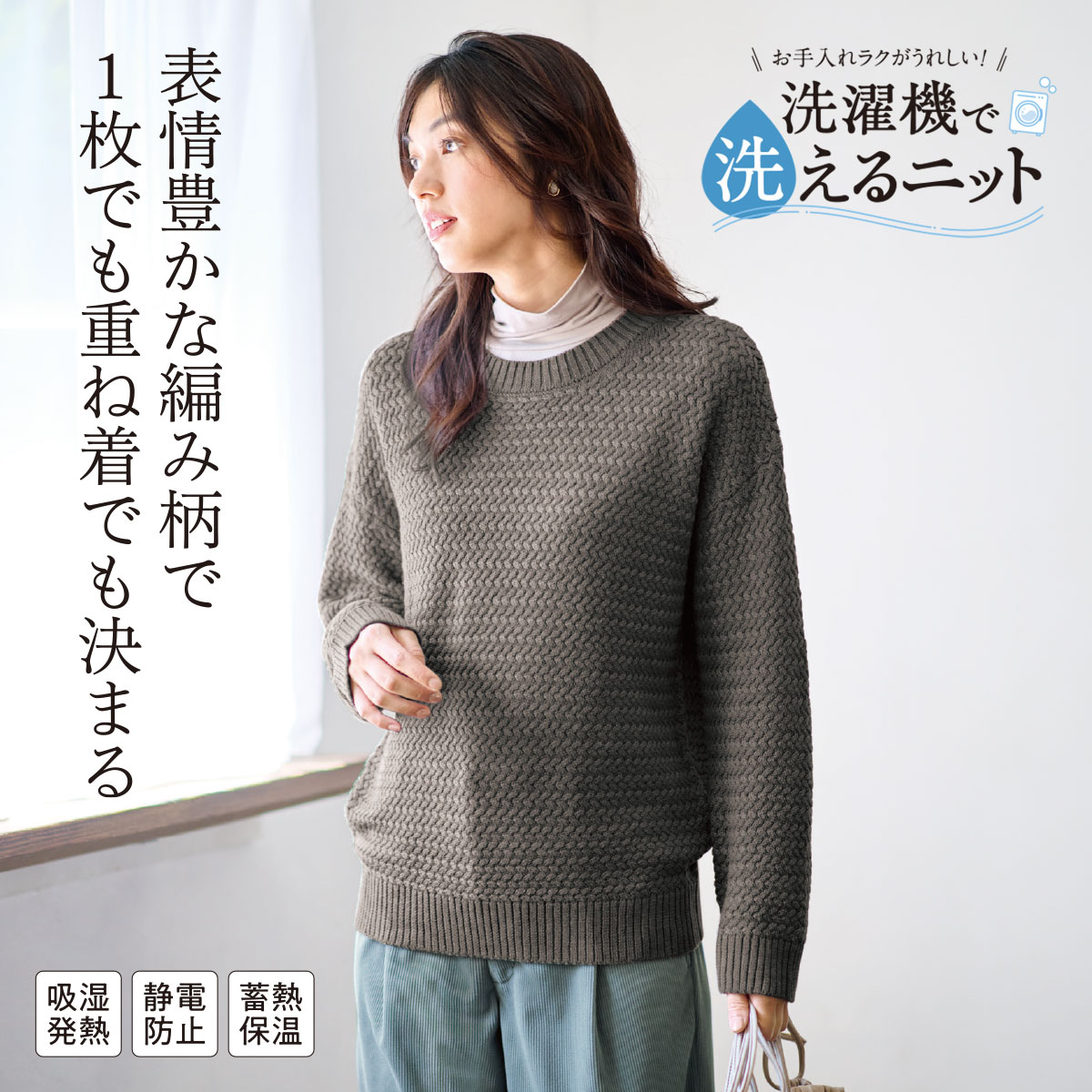 -お買い得ポイント-吸湿発熱、静電気防止、蓄熱保温などの機能性と、お家の洗濯機で洗えるのが特徴です。バスケット編みもポイント♪-デザイン-暖かく、なめらかな着心地で快適。クルーネックなので重ね着もしやすいデザインです。-素材特徴-お家で洗えて静電気も軽減できる!吸湿発熱、静電気防止、蓄熱保温の機能性もあり着心地快適な素材です。