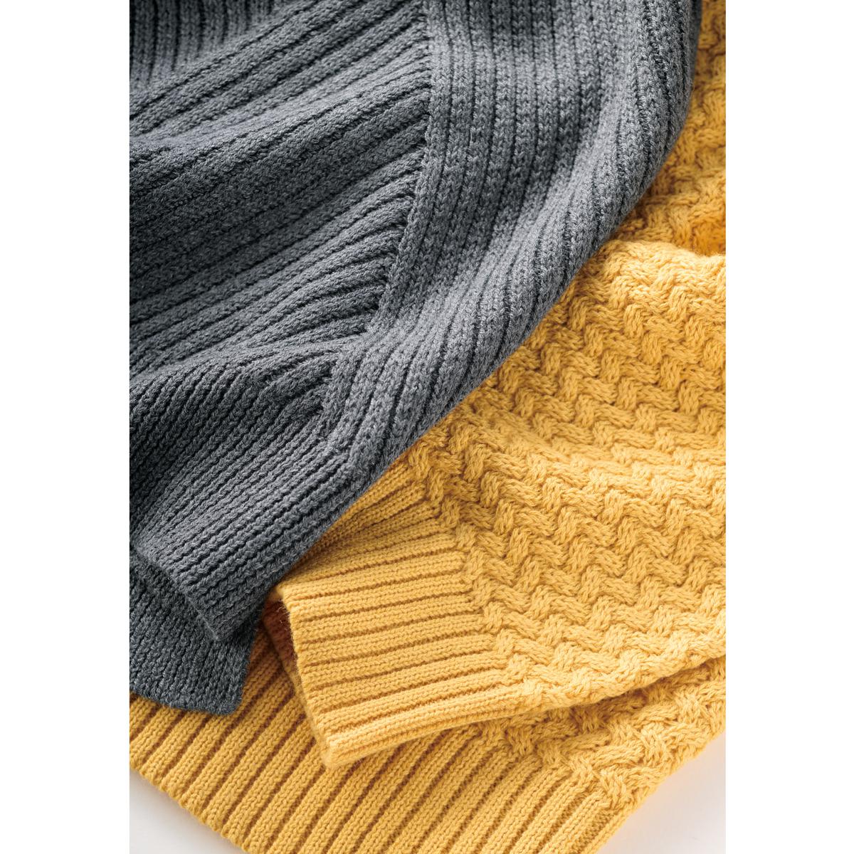 お家の洗濯機で洗えるニットです。(上から)チャコールグレー、マスタード
