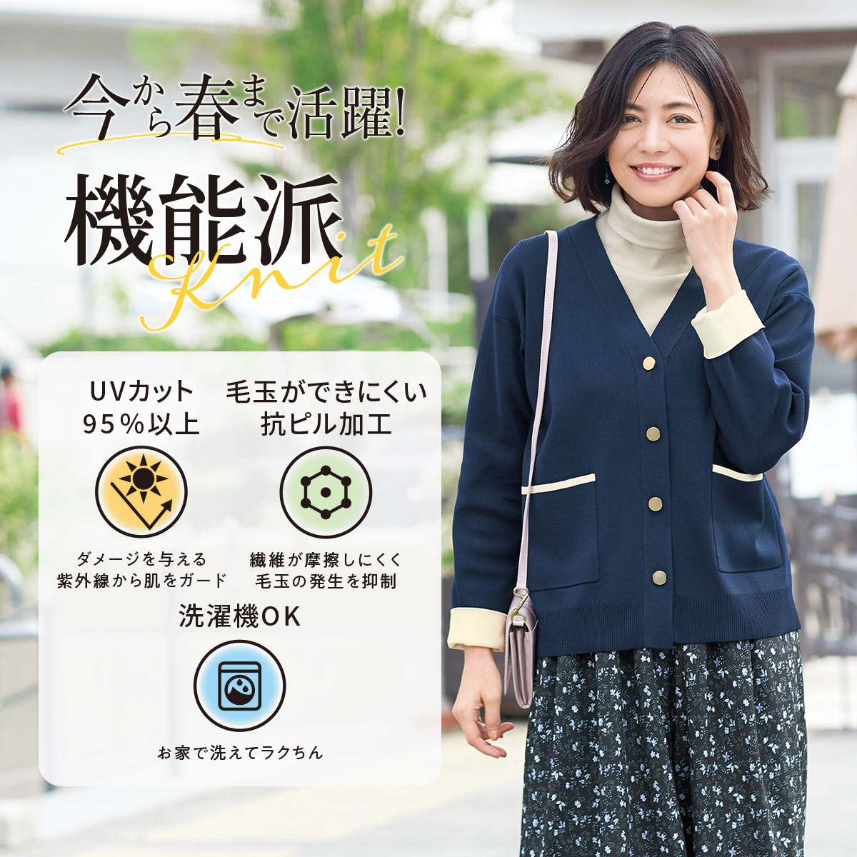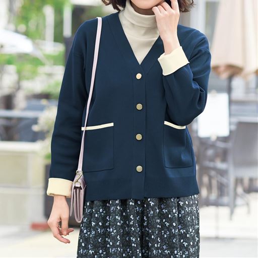 -お買い得ポイント-寒暖差のある季節にジャケット感覚で着るのもおすすめです。-デザイン-お出かけにちょうどいい、上品なデザインが素敵。ポケットの配色がアクセントに。袖口を折り返しても◎。-素材特徴-毛玉ができにくい、なめらかな生地表面に仕上げた総針編み。ボディラインを拾いにくいしっかりした質感です。
