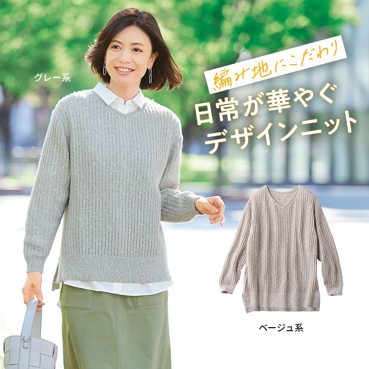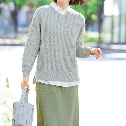 ネップ糸を使って表情豊かなニュアンス。深すぎないVネックが顔まわりをシャープに見せます。
