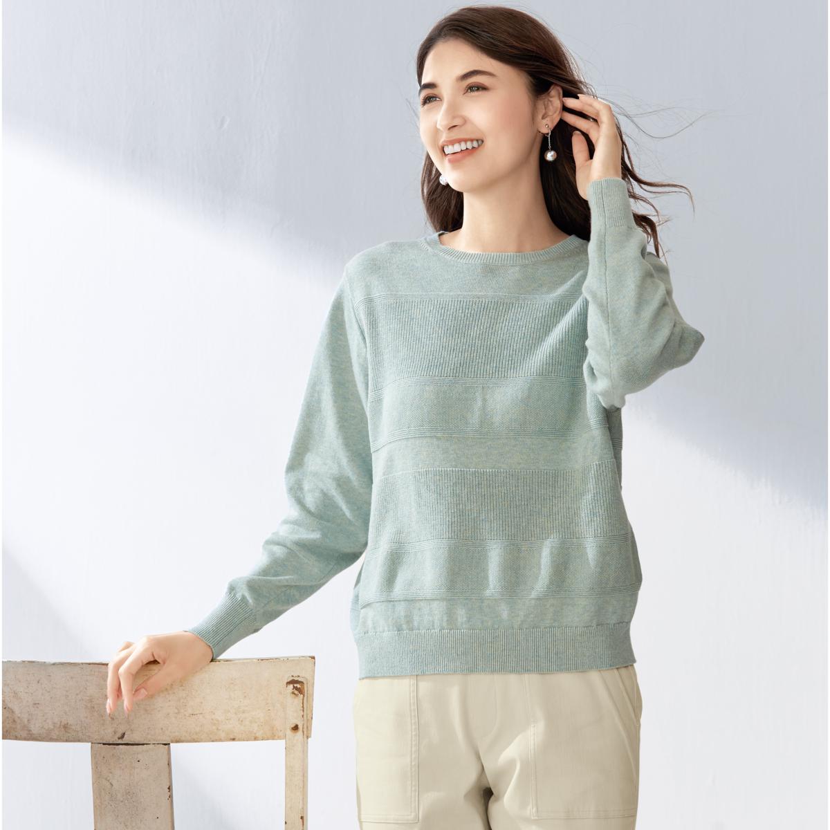 ランダムなボーダーの編み柄が豊かな表情を醸し出し、1枚で美しい佇まいに。柔らかな肌心地に愛着が増します。