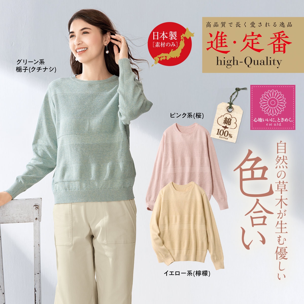 (上から)グリーン系(梔子)、イエロー系(檸檬)、ピンク系(桜)※カーディガンはMS-3265です。