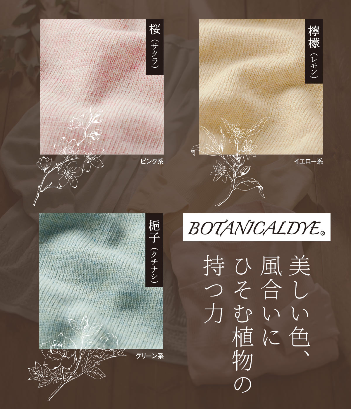 花や果実、草木などの植物から抽出した染料と安全な化学染料を融合させ、綿(わた)染めした日本製の糸を使用。数色の綿(わた)をミックスすることで自然界の表情豊かな色彩を実現。ナチュラルな質感のまま、色の美しさが損なわれないよう、定着度を強めました。