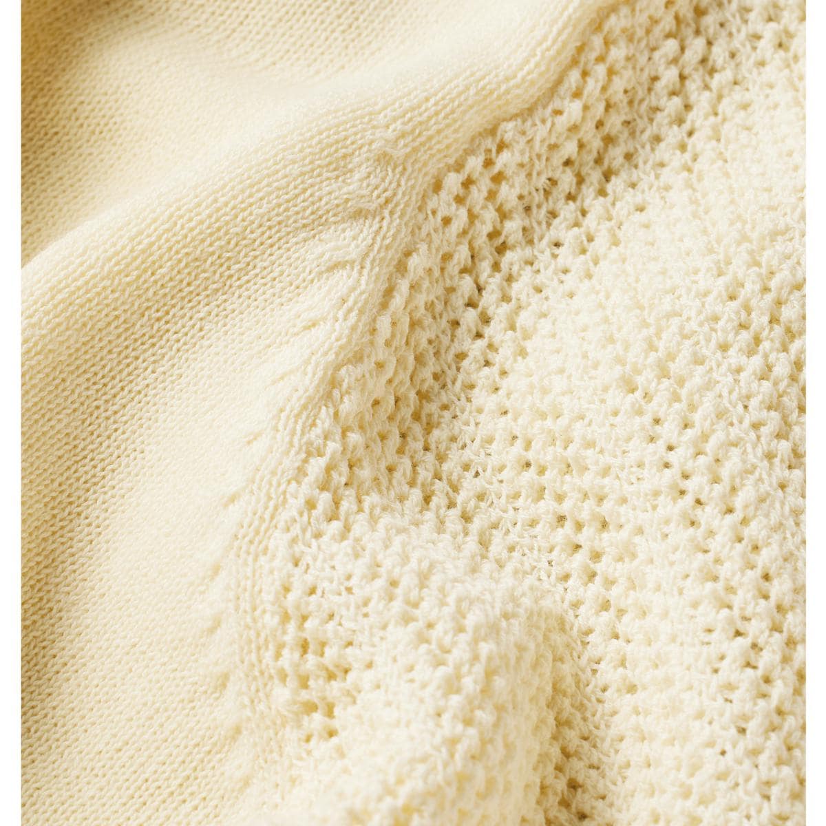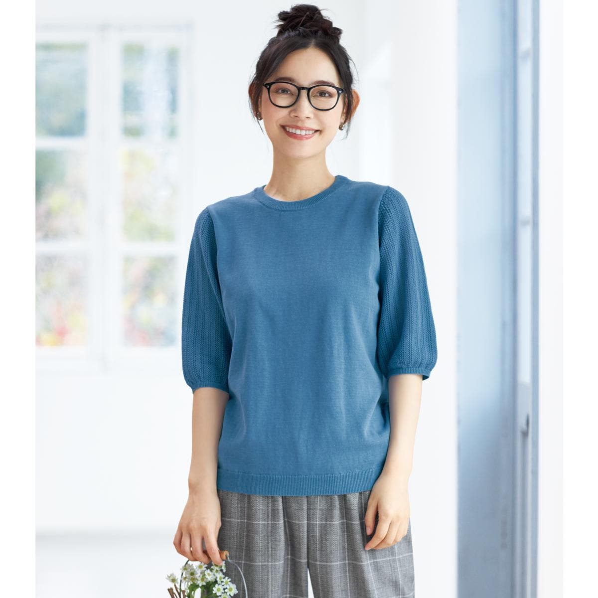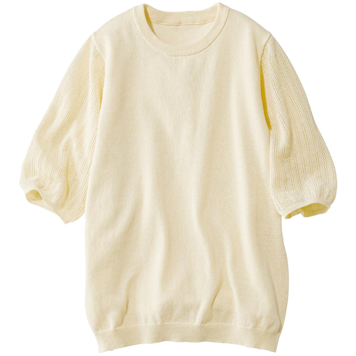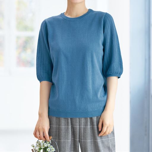 -お買い得ポイント-袖を通すだけで気分が高まる表情豊かな柄編みが着こなしを涼やかに見せます。-デザイン-袖に透かし編みをあしらって腕まわりを涼しげな印象に。着回しやすいシンプルなデザインです。-素材特徴-さらっと快適な着心地で肌にまとわりつきにくい強撚の綿100%ニットです。