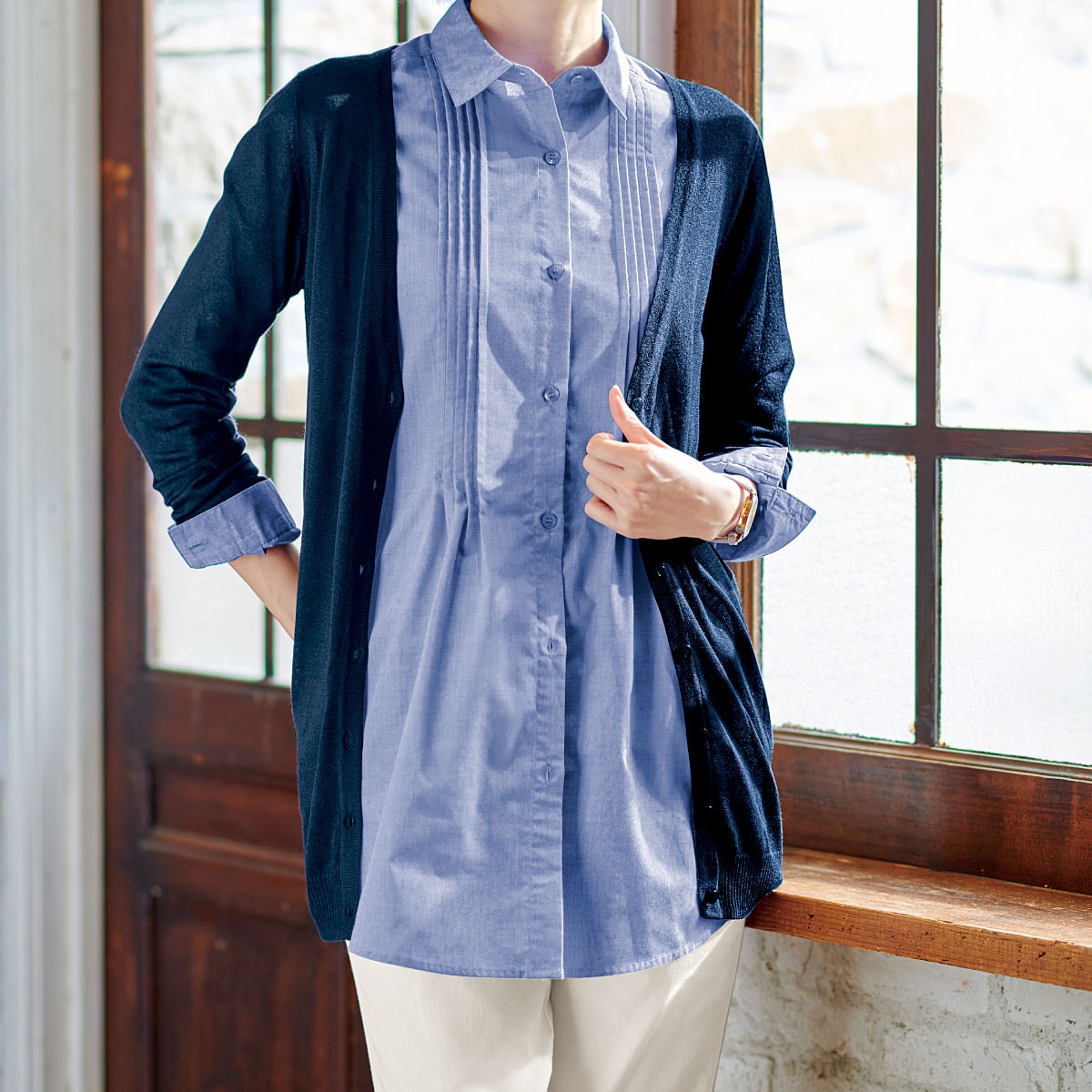 ヒップが隠れるロング丈は、旬感満載で体型カバーにもお役立ち。