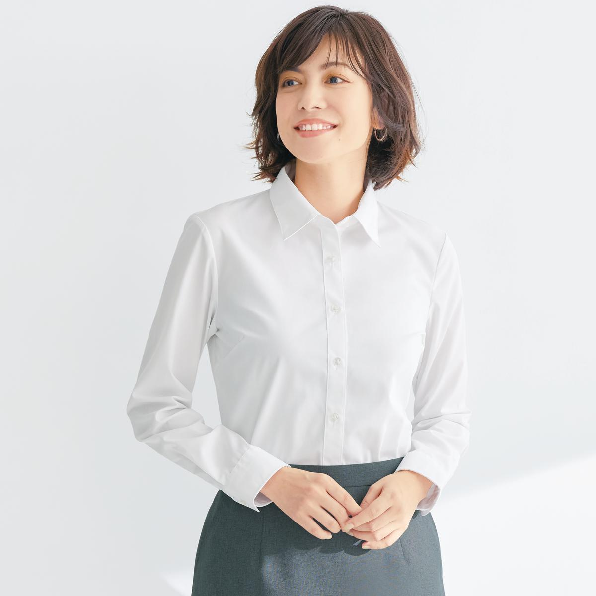 -お買い得ポイント-超ロングセラーの優秀アイテム!!UVカット機能を備えた形態安定シャツです。-デザイン-「女性らしさが欲しい」というお客様の声にお応えし、衿やボタンを小さめにデザイン。着丈が長めなので、かがんだ時の背中見えを軽減。シルエットをよりシャープにし、カフスも小さくして華奢見えを実現!!-素材特徴-UVカット率が95%以上と、どんな季節も安心♪抗菌防臭機能もプラスし、クリーンな印象をキープ。シワになりにくく、アイロンがけが軽減できます☆