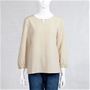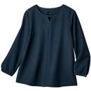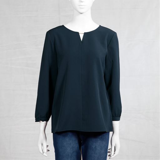 -ポイント-シンプルなデザインでアクセサリーいらず、1枚でコーディネートが決まるマストアイテムです。-デザイン-キーネックにゴールド調のメタルバーでデコルテをきれい見せし、シンプルながら華やかなデザインに。少しギャザーをよせた袖口がフェミニンな一枚。-素材特徴-適度な厚みでハリがあってシワになりにくいダブルクロス素材。とろみのある肌ざわりも特徴。
