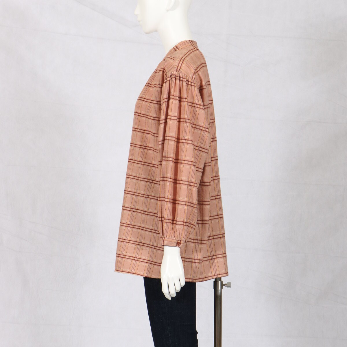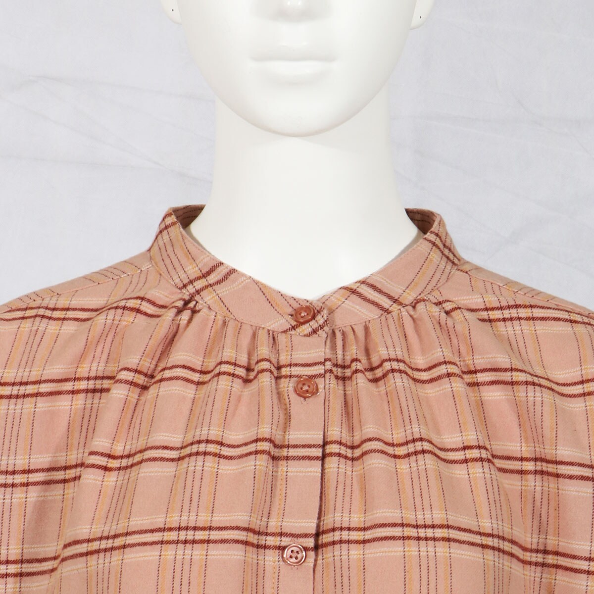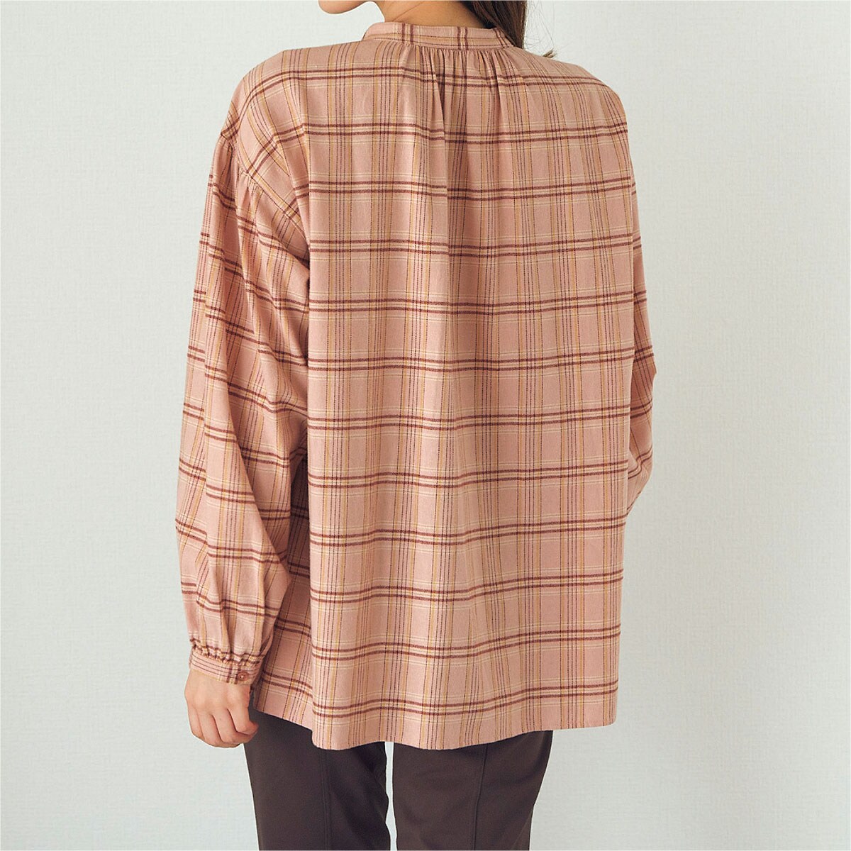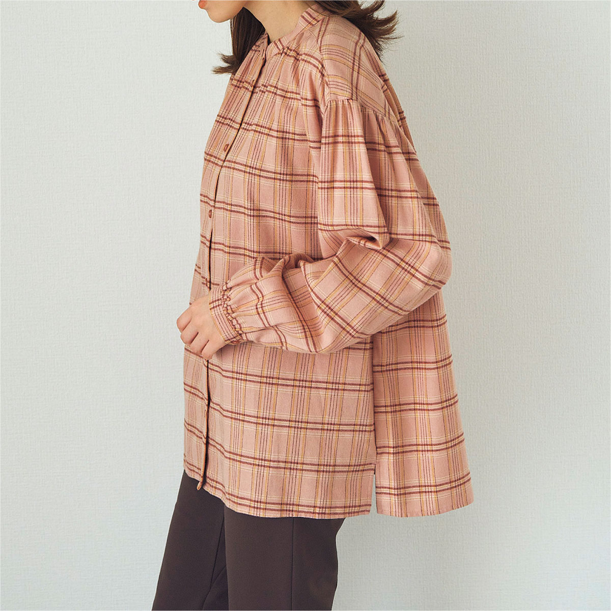 ■生地綿100%。表がほんのり起毛のコットンビエラ。程よい厚みがあり軽い着心地も魅力。やわらか起毛のビエラシャツは、気持ちよくて手放せない!生地表面をうっすら起毛させた、やわらかな肌ざわり。程よい厚みがある軽い着心地も魅力です。■デザインノーカラ―で顔まわりをスッキリ見せ!衿と袖のギャザーが可愛いい。