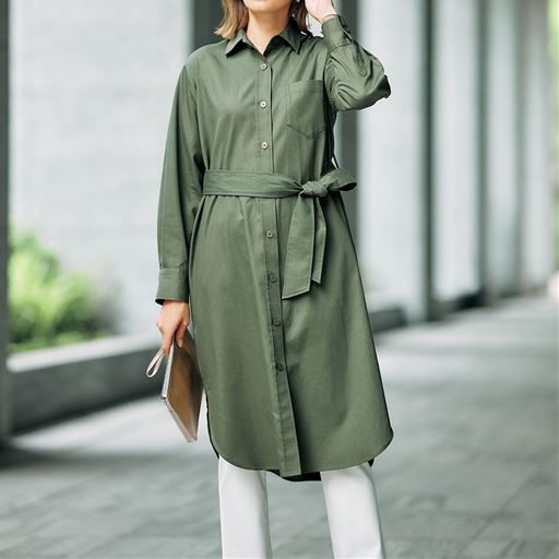 -ポイント-シャツ以上コート未満のチュニックシャツは、1枚2役!!ひざまでの長め丈で縦にすっきり見えます。-デザイン-フロントの開け閉めで、2通りの着こなしが楽しめる仕様。両脇ベルトループ付きで、取り外し可能なウエストベルトを通せば、より着こなしの幅が広がります。-素材特徴-オックスフォードクロスと呼ばれる生地で、中でも微光沢の表面がきれいなポリエステル素材を使用。他のシャツに比べて厚くて丈夫なのに、ソフトで通気性のよいのも特徴です。お洗濯後のケアがラクで、毎日着たくなる手軽さも魅力です。