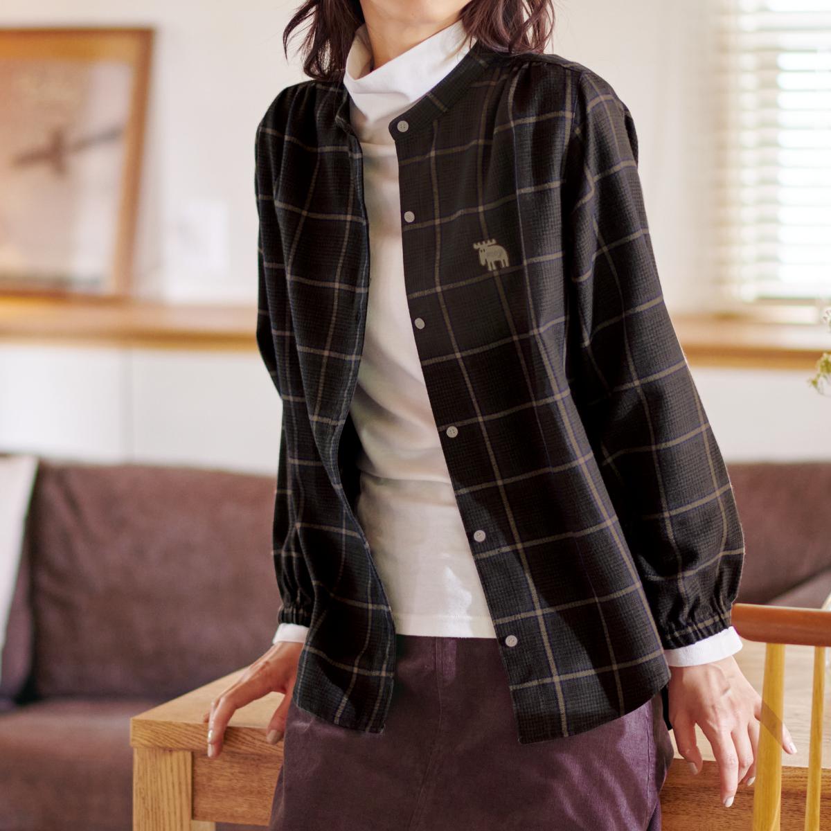 -お買い得ポイント-ぬくもりのある素材感のネルシャツ。シンプルなデザインのバンドカラーで、1枚でも羽織りでもナチユラルな雰囲気で着こなせます-デザイン-着回ししやすいシンプルなデザイン肩や袖のギャザーがかわいらしいポイント-素材特徴-起毛感があり、ふんわりあたたかみのある肌ざわり