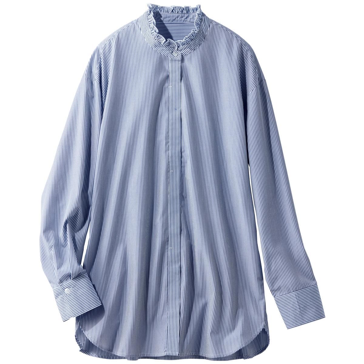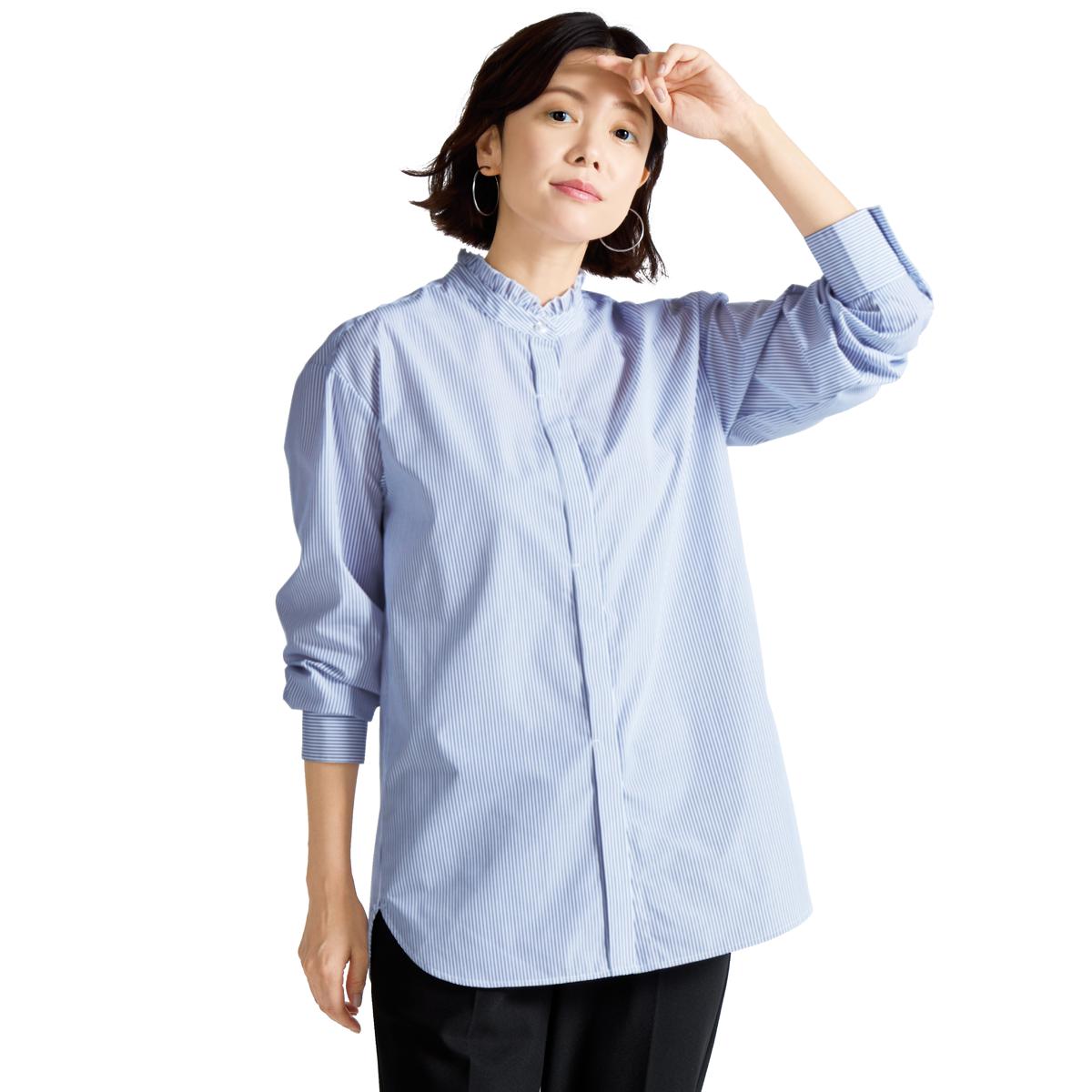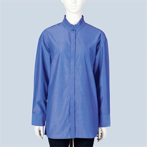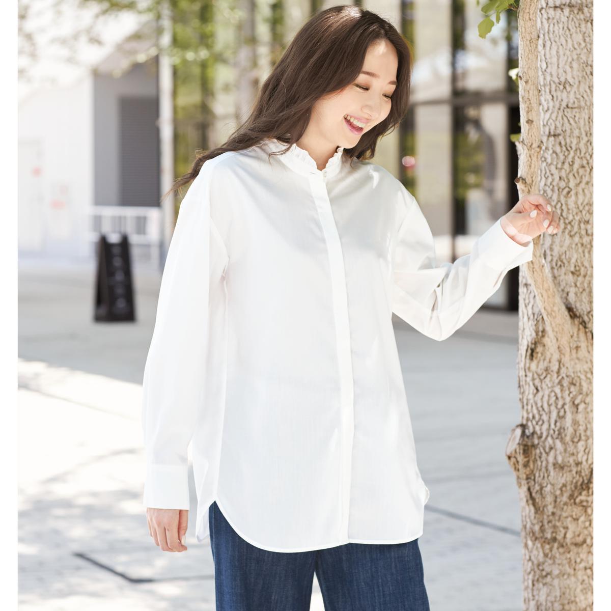 -お買い得ポイント-肌寒い日はお手持ちのベストやカーディガンと合わせて重ね着に、暖かい日はトップスとして、これ1枚で着回しできて便利です。-デザイン-顔まわりに華やぎを添えるフリル衿と、すっきり感を演出する比翼仕立てできちんと見え。ボタンを開けて羽織りとして使ってもサマになります。-素材特徴-洗濯機で洗えて、乾きが早くしわになりにくい!お手入れ簡単なポリエステル素材なのにコットンのようなナチュラルな風合いで、さらっとした着心地が特徴のラクロン生地です。