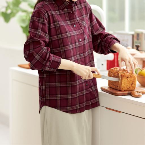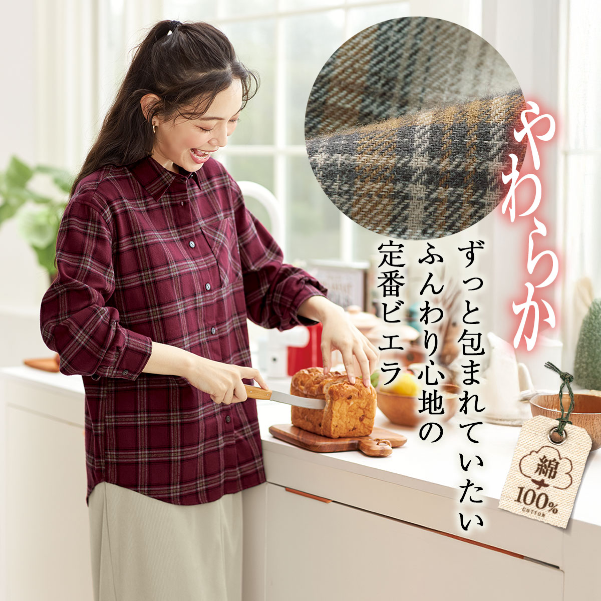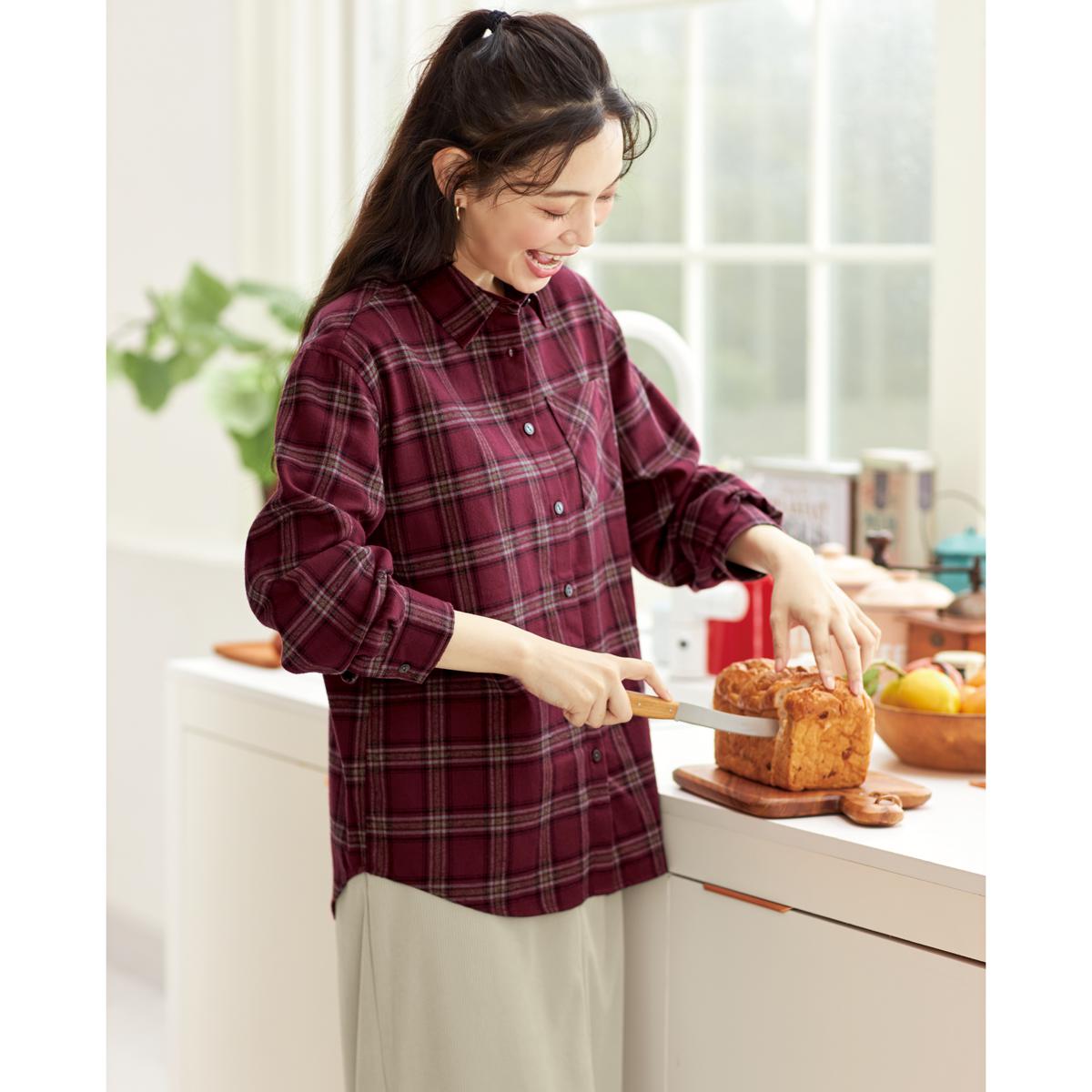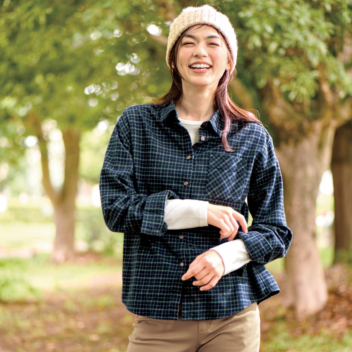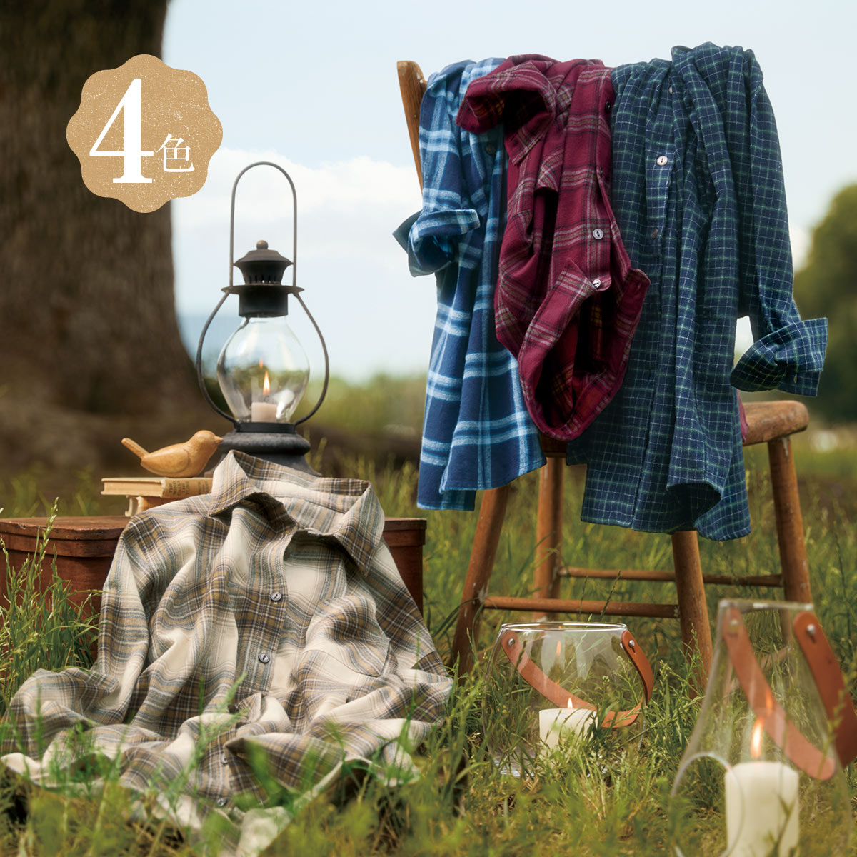 -お買い得ポイント-インでも羽織りでもサマになる、大人に似合うチェック柄を揃えました。-デザイン-前を閉めてもコーディネートしやすい、ゆとりのあるシルエット。トレーナーやニットのインでも合わせやすい細かいチェック柄もご用意しました。インで着れば衿元・袖口のアクセントにも。-素材特徴-うっすら起毛したコットンビエラ素材で、ふんわり柔らかくあたたかい。洗濯機OK!