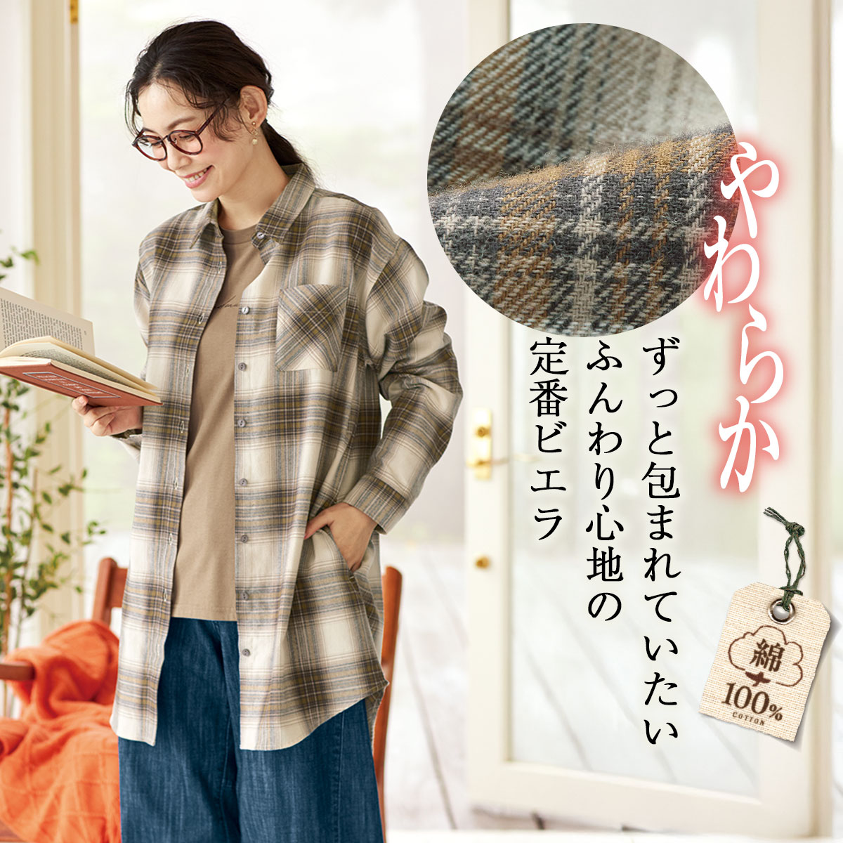 -ポイント-モニターアンケートで全柄リニューアル!!ボタン閉めでチュニックでもボタンを開けて羽織りでもサマになる、大人に似合うチェック柄を揃えました。-デザイン-太ももまでカバーする丈であったか快適♪羽織りとし重ね着できるように、ゆったりしたシルエットで仕上げました。お客様の声にお答えし、便利なポケットも追加してリニューアル。-素材特徴-うっすら起毛したコットンビエラ素材で、ふんわり柔らかくあたたかい。