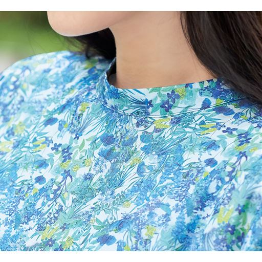 -お買得ポイント-ウエスト切替とギャザーでふわりと広がるシルエットが、腰回りをこっそりカバーしてくれます。-デザイン-程よい開きのスタンドネックデザインで、初夏に重宝します。すっきりとした後ろボタン仕様。-素材特徴-小花柄の水彩画風プリント生地が、優しい印象で優雅な装いに。
