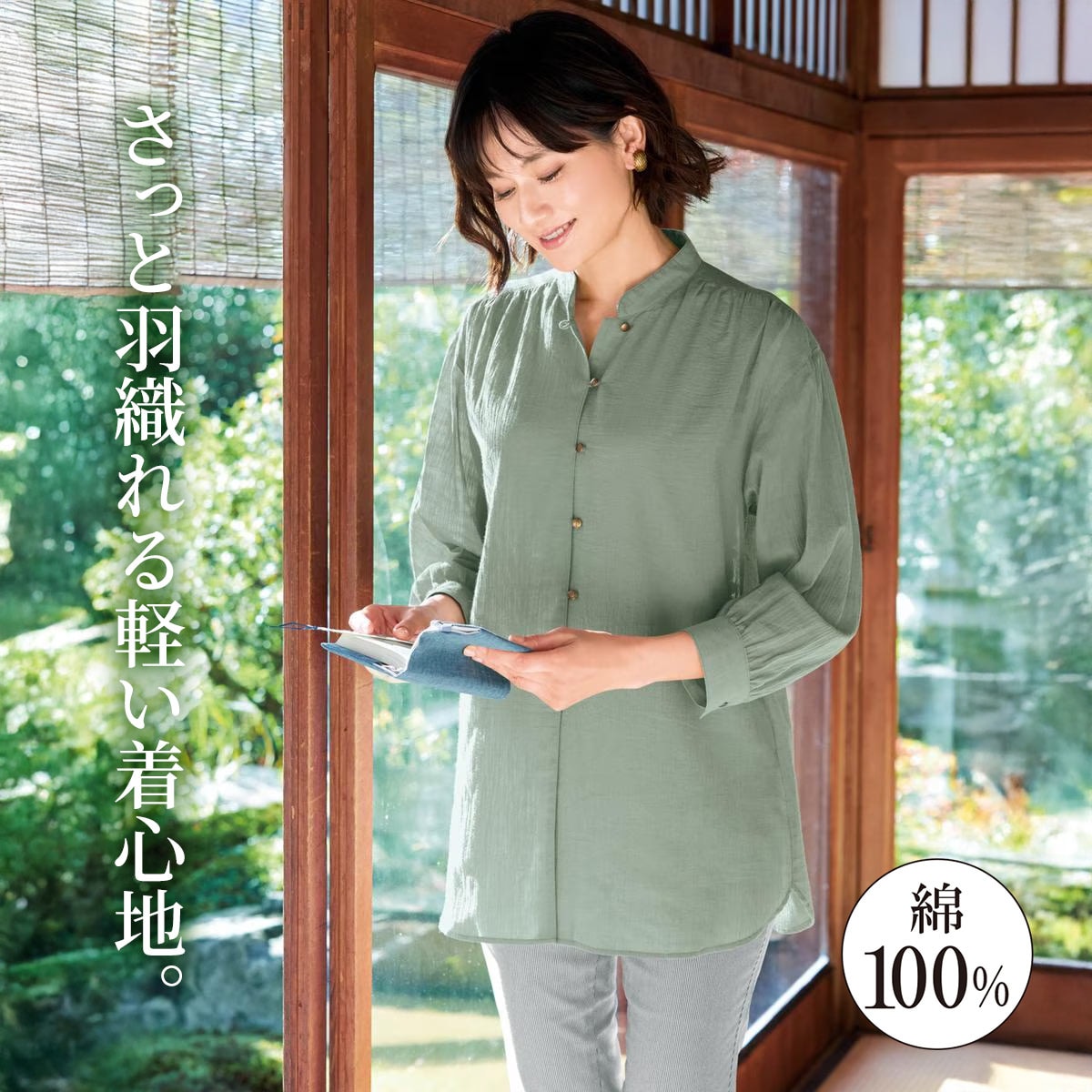 • 上品な透け感で表面感のある楊柳素材が肌にまとわりつきにくく快適。サッと羽織れる軽い着心地です。