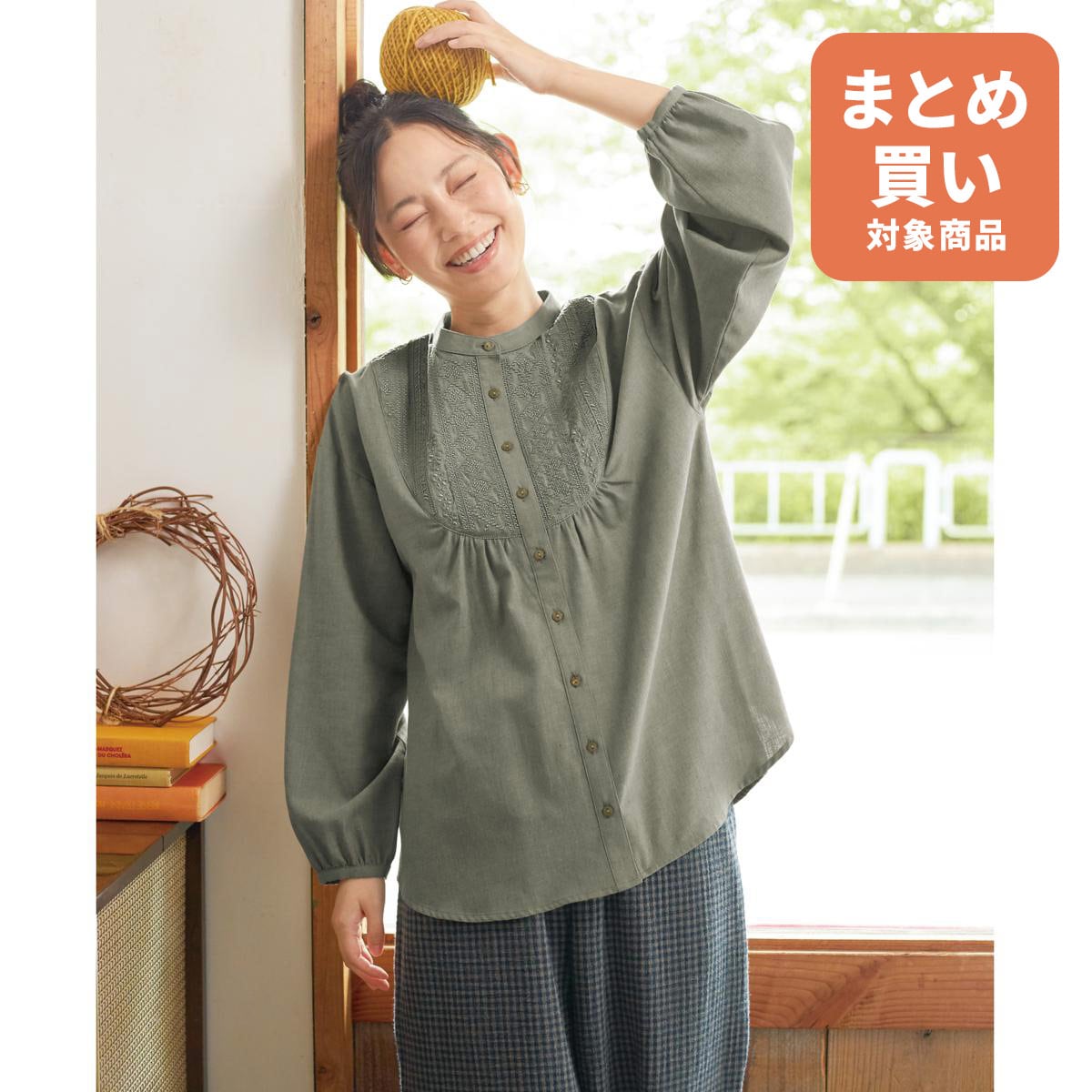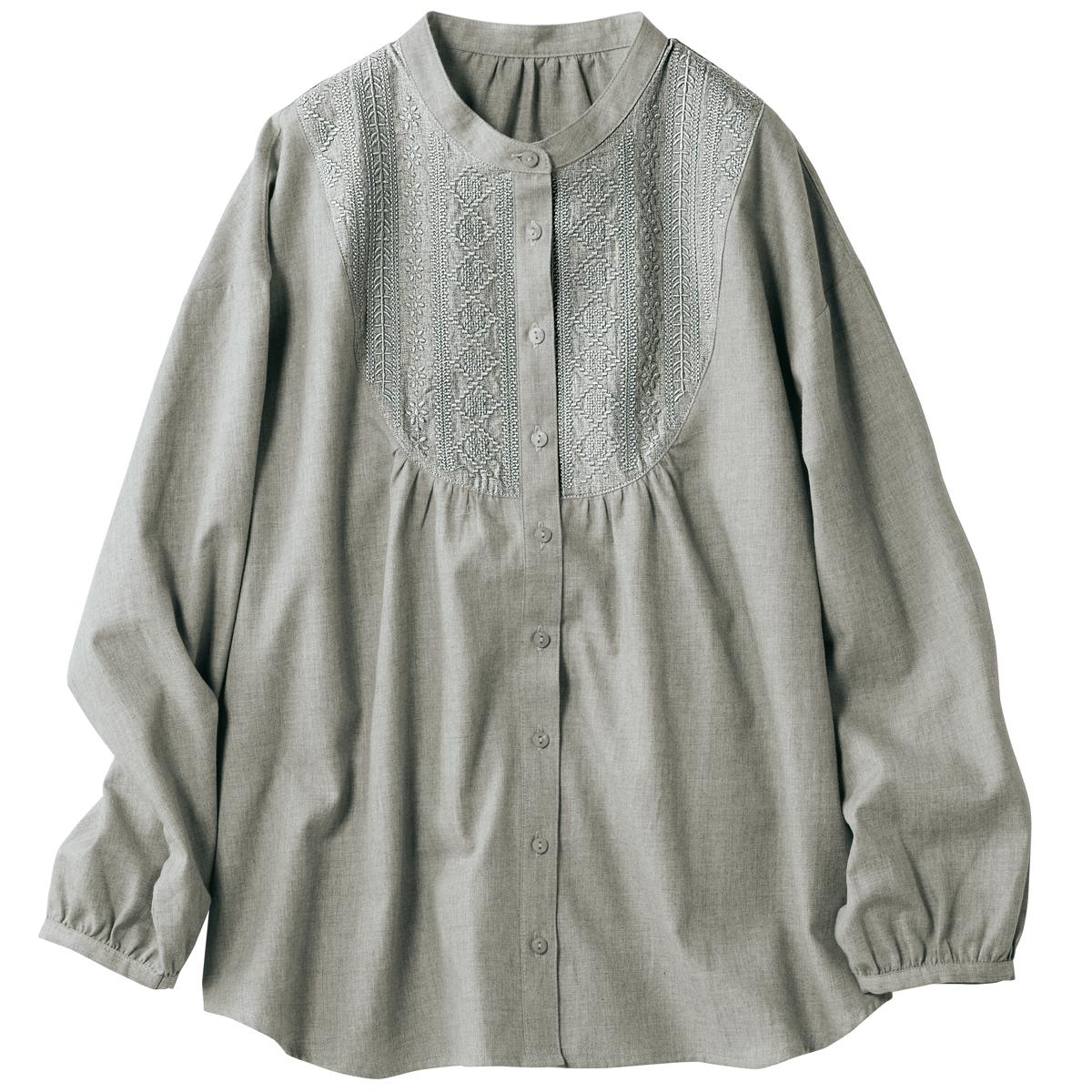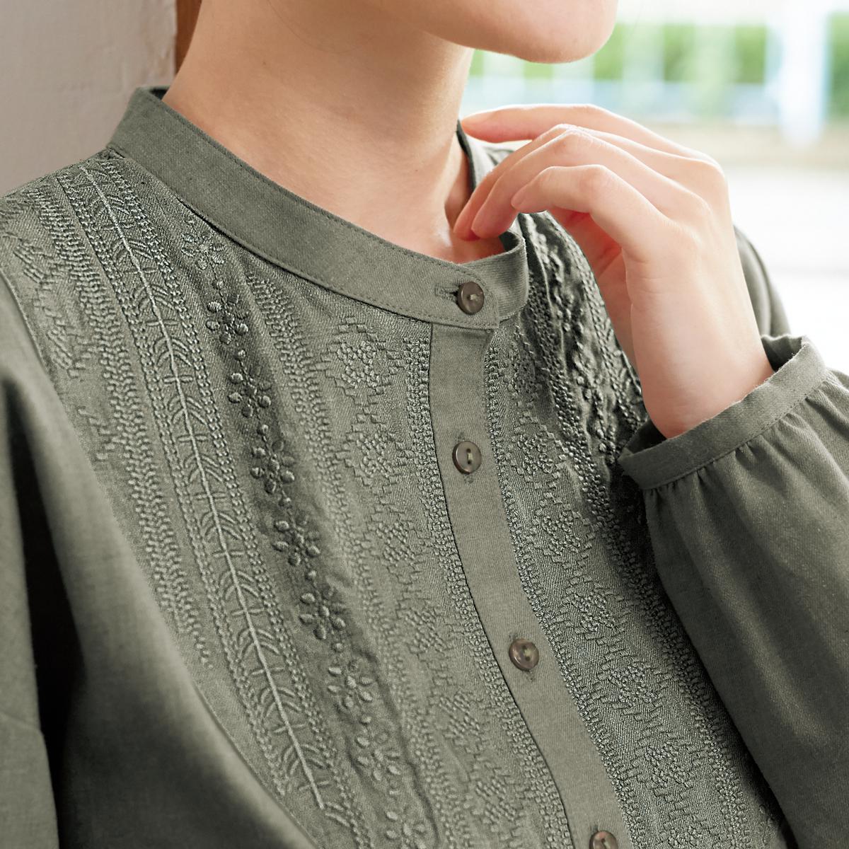 -お買い得ポイント-愛らしい雰囲気を醸し出す可憐な刺しゅうや、窮屈感のないゆるやかなシルエットが秋のおしゃれ心を満たします。-デザイン-胸元の繊細な刺しゅうと杢調カラーが上品な着こなし。体のラインを拾いにくいシルエットでさりげなく体型カバーでき、バンドカラーですっきりした印象に。-素材特徴-肌をやさしく包み込む柔らかな風合いの綿100%素材で軽やかな着心地。