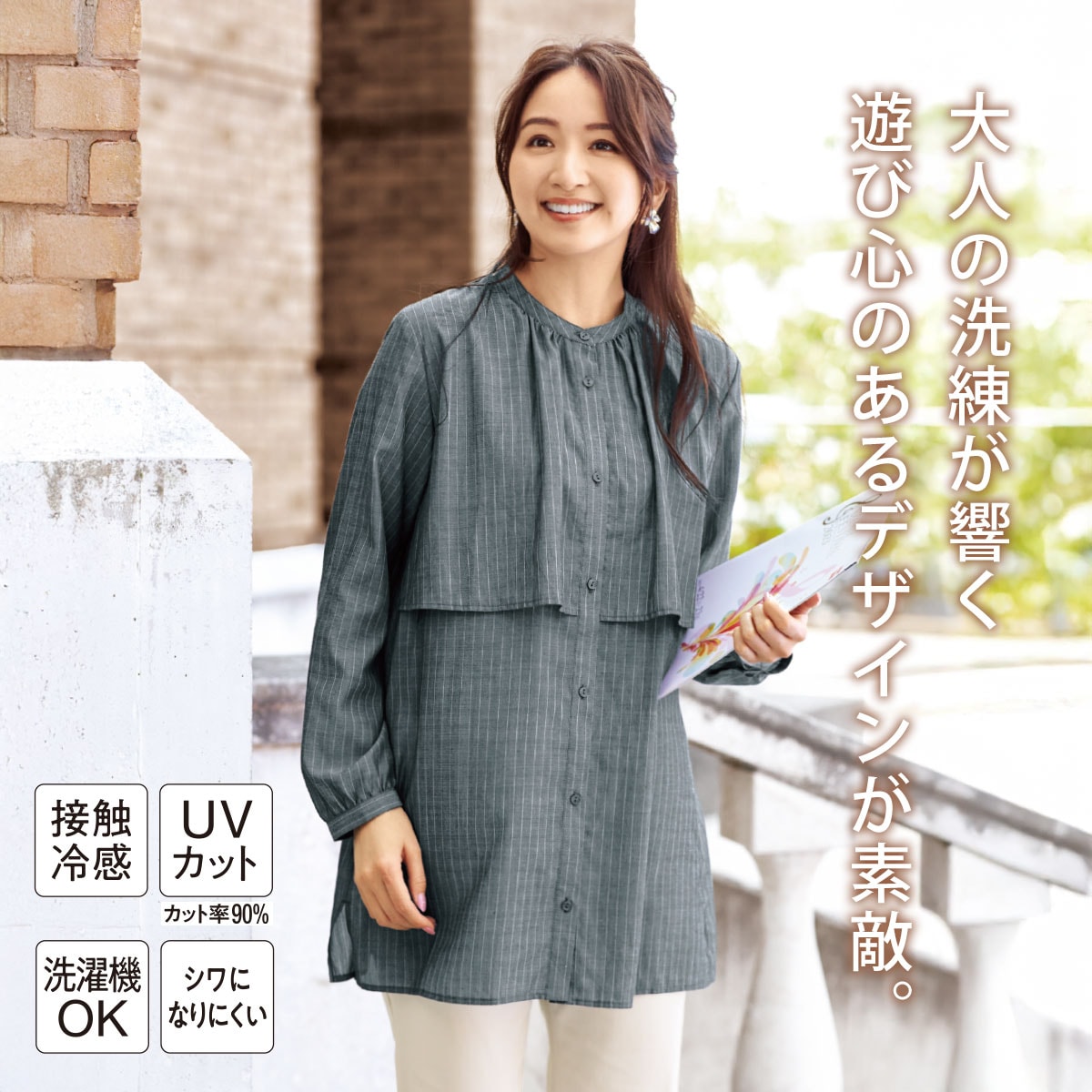 ヒップが隠れるチュニック丈やバンドカラーですっきりした佇まいです。