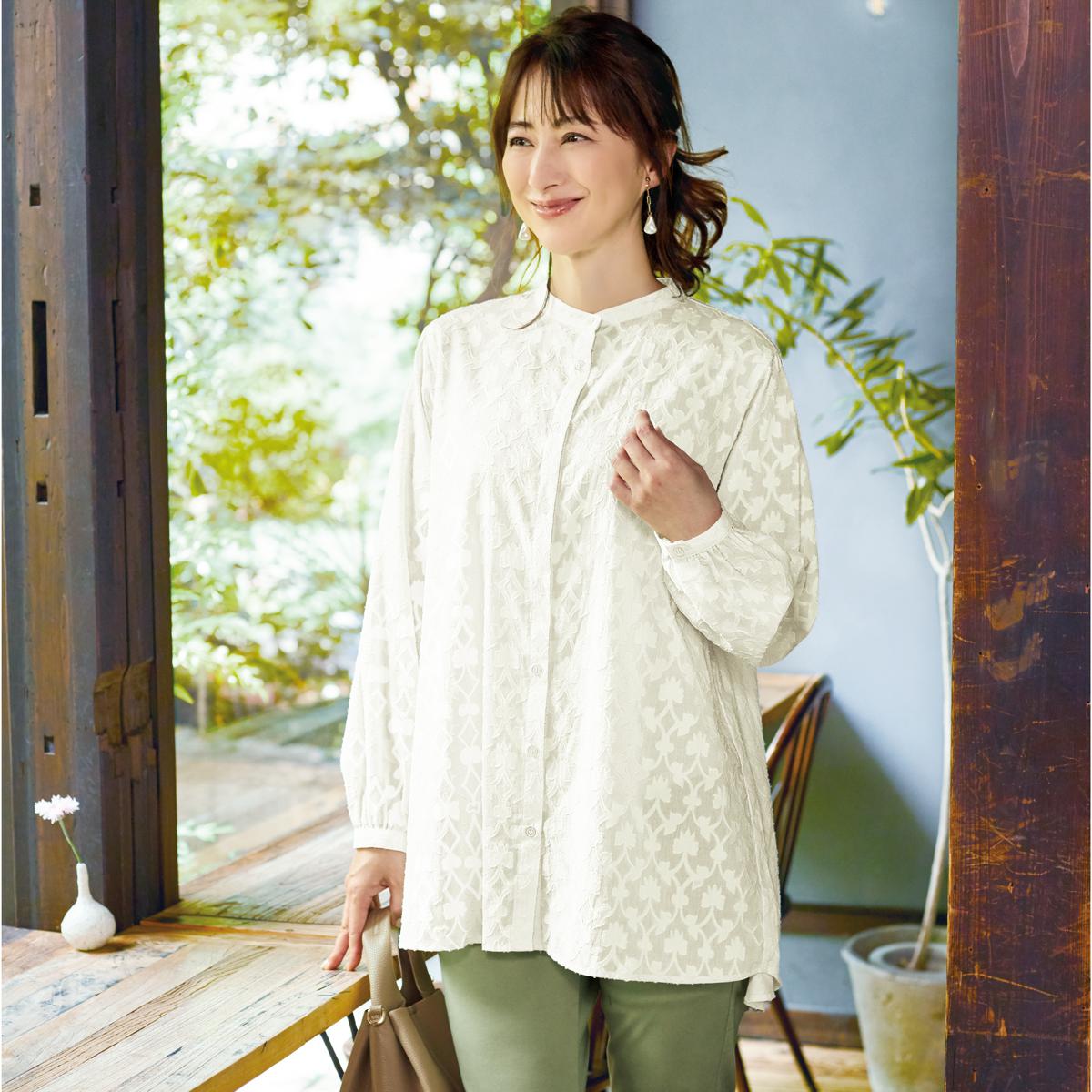 -お買い得ポイント-ふわっと羽織れるゆったりシルエットです。-デザイン-立体感のあるジャカードと透け感が華やぎをプラス。ゆったりしたシルエットと長めの着丈で気になるところをカバーできます。-素材特徴-綿100%素材の優しい肌あたりに、ジャカード織りの高級感が加わった、風合いの良い生地です。