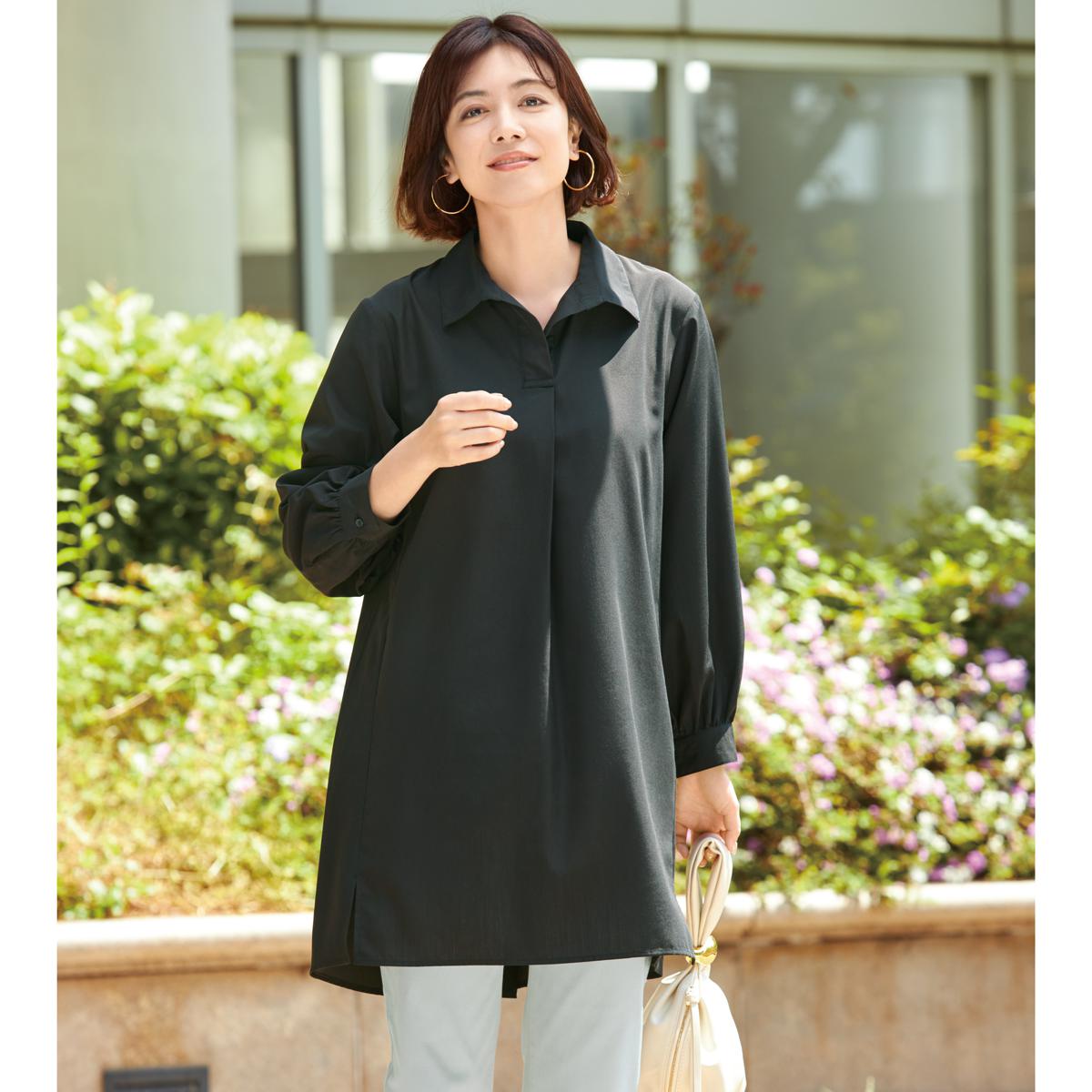 -お買い得ポイント-長めの丈でヒップ回りをカバーしています。パンツと合わせて気軽にお出かけ。-デザイン-スキニーパンツと好相性の長め丈。後ろボタンのあしらいで360度キレイ見せ。-素材特徴-コットンのようなナチュラルな風合いが特長。ポリエステル本来の速乾性を保ちながら、さらっとした着心地を持続します。洗濯してもシワになりにくいイージーケア素材。