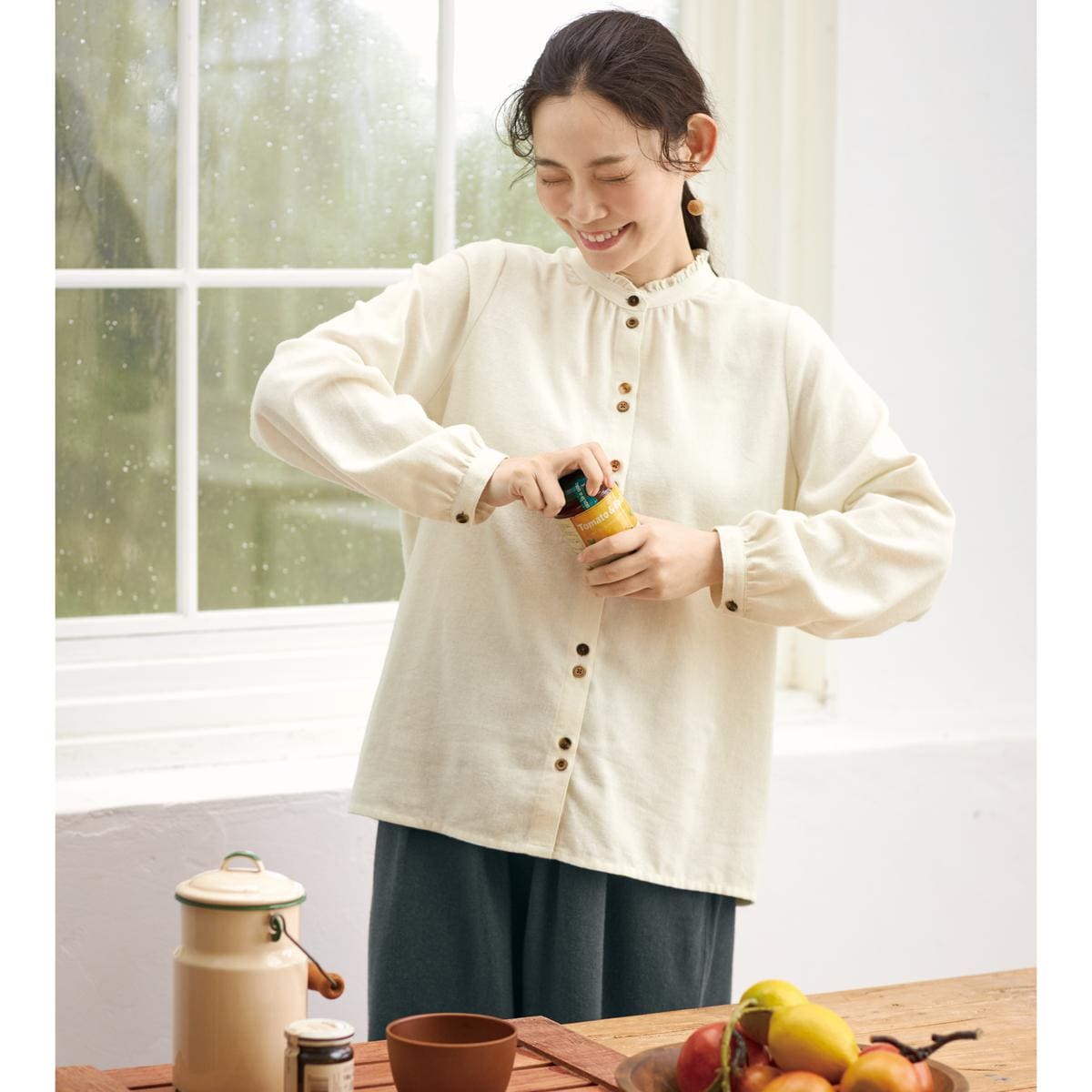 表情の異なるボタンと衿のフリルが大人の可愛らしさを引き立てます。(オフホワイト着用)
