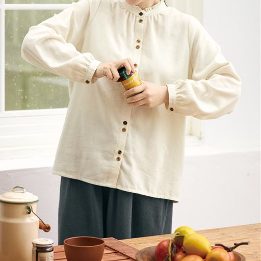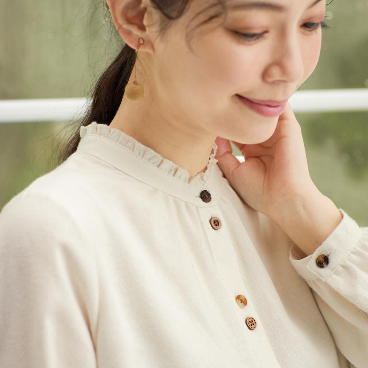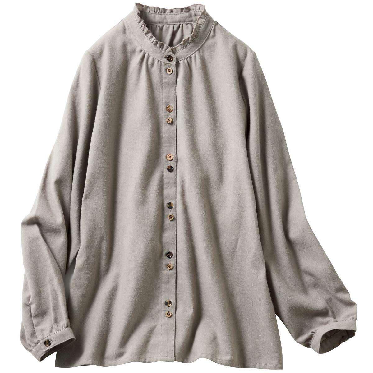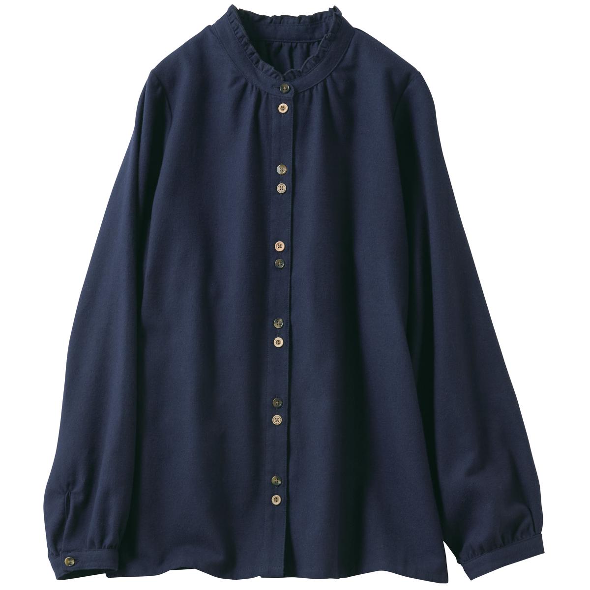 -お買い得ポイント-ふんわりと柔らかで、見かけ以上に暖かいブラウスです。衿のフリルが可愛く映え、お出かけが楽しくなりそう!-デザイン-表情の異なるボタンと衿のフリルが大人の可愛らしさを引き立てます。-素材特徴-ふっくらとした風合いで、暖かく肌触りが柔らかいのが魅力です。