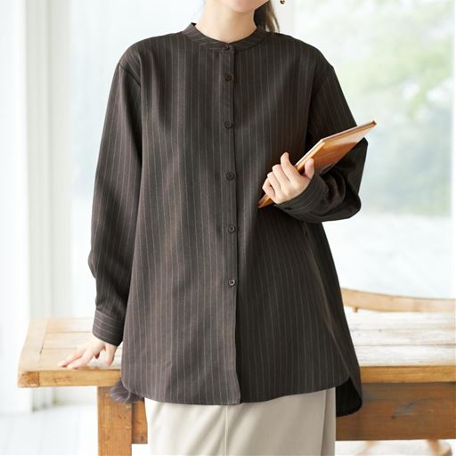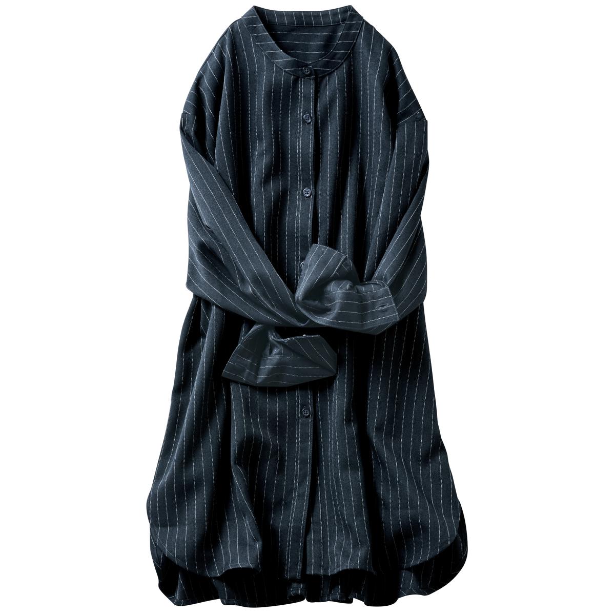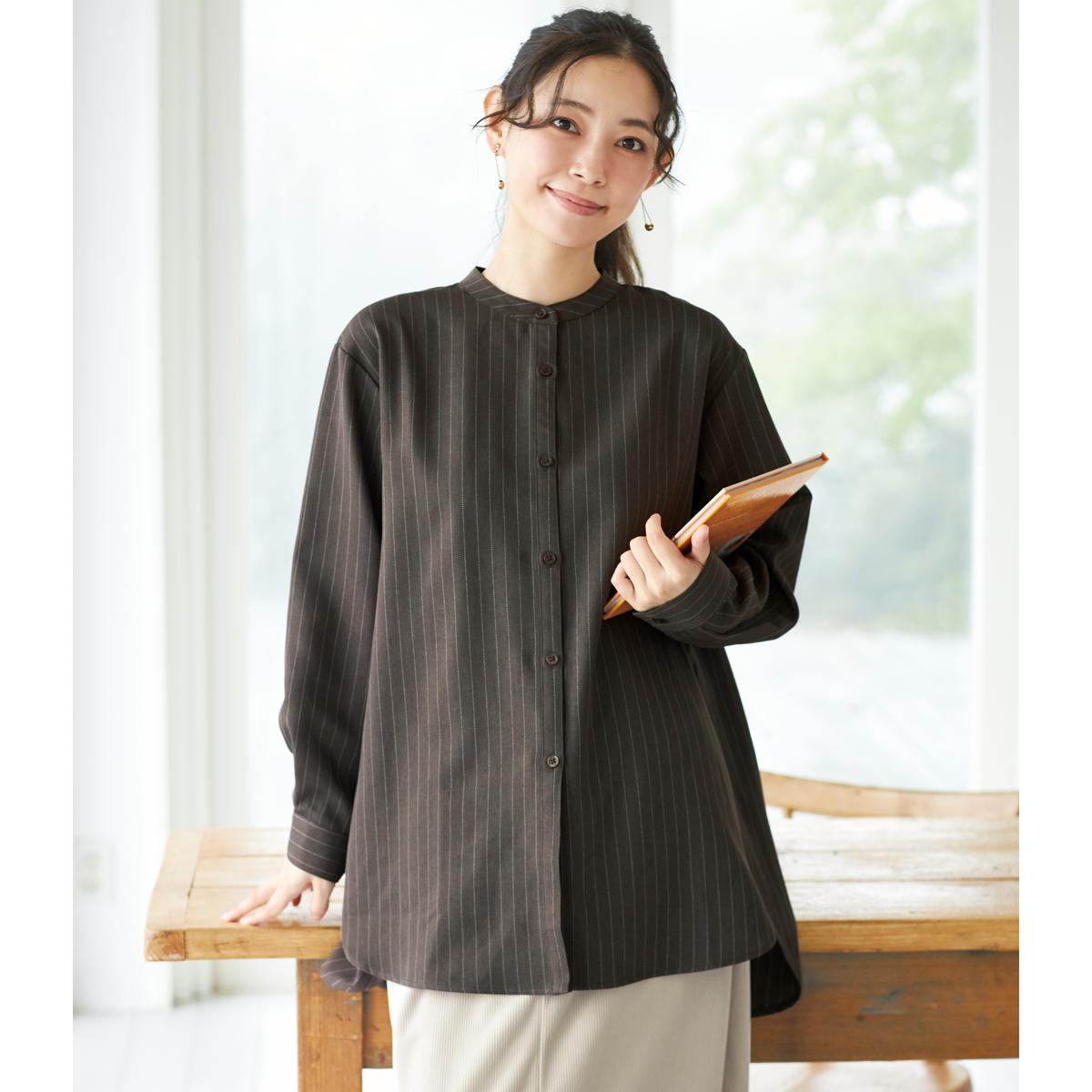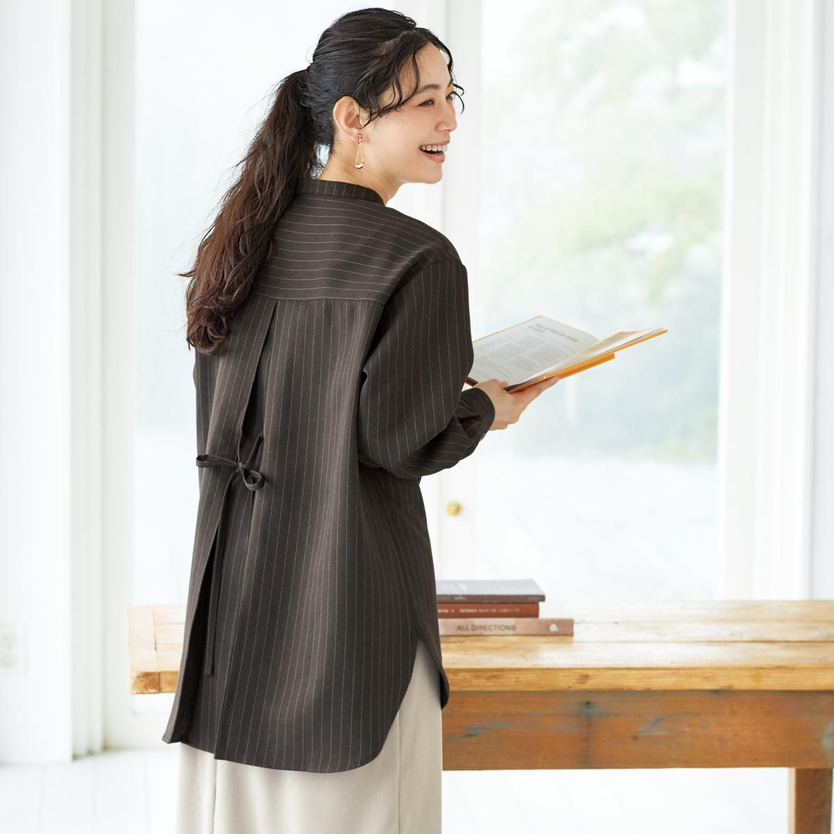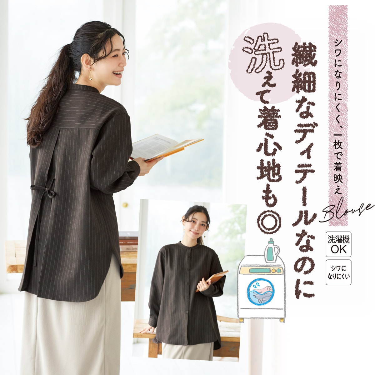 -お買い得ポイント-背中の飾りリボンがアクセントに。後ろ丈が長めに設計されていて、体型カバーに一役買っています。-デザイン-バンドカラーと細めストライプでシャープに見せながら、後ろのリボンで愛らしさも。ヒップが隠れるゆったりシルエットです。-素材特徴-シワになりにくく、しなやかなで滑らかな風合いです。洗濯機で洗えるのでお手入れ楽ちん。