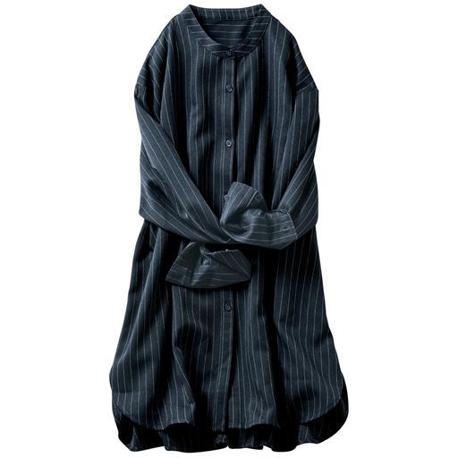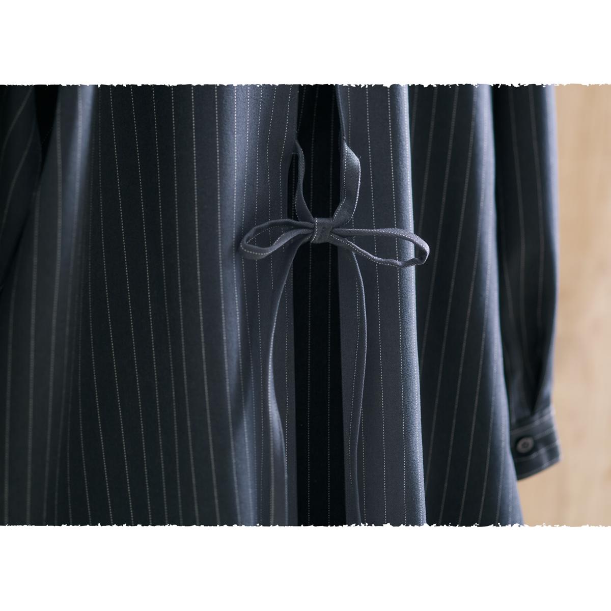 バンドカラーと細めストライプでシャープに見せながら、後ろのリボンで愛らしさも。ヒップが隠れるゆったりシルエット。