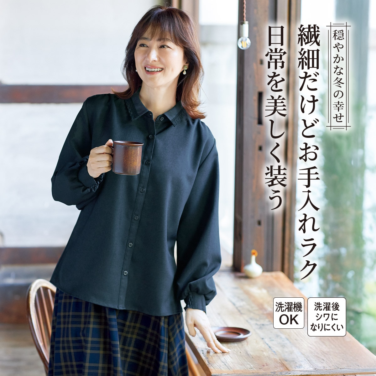 -お買い得ポイント-さりげないレースにうきうき気分がとまらない。一枚でこなれ感が増します。-デザイン-可憐なムードを印象づける衿元の繊細なレースが、アクセサリーなしでも顔まわりを華やかに。-素材特徴-シワになりにくく、しなやかなで滑らかな風合いです。洗濯機で洗えるのでお手入れ楽ちん。