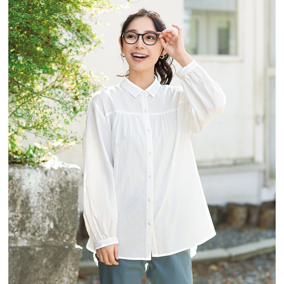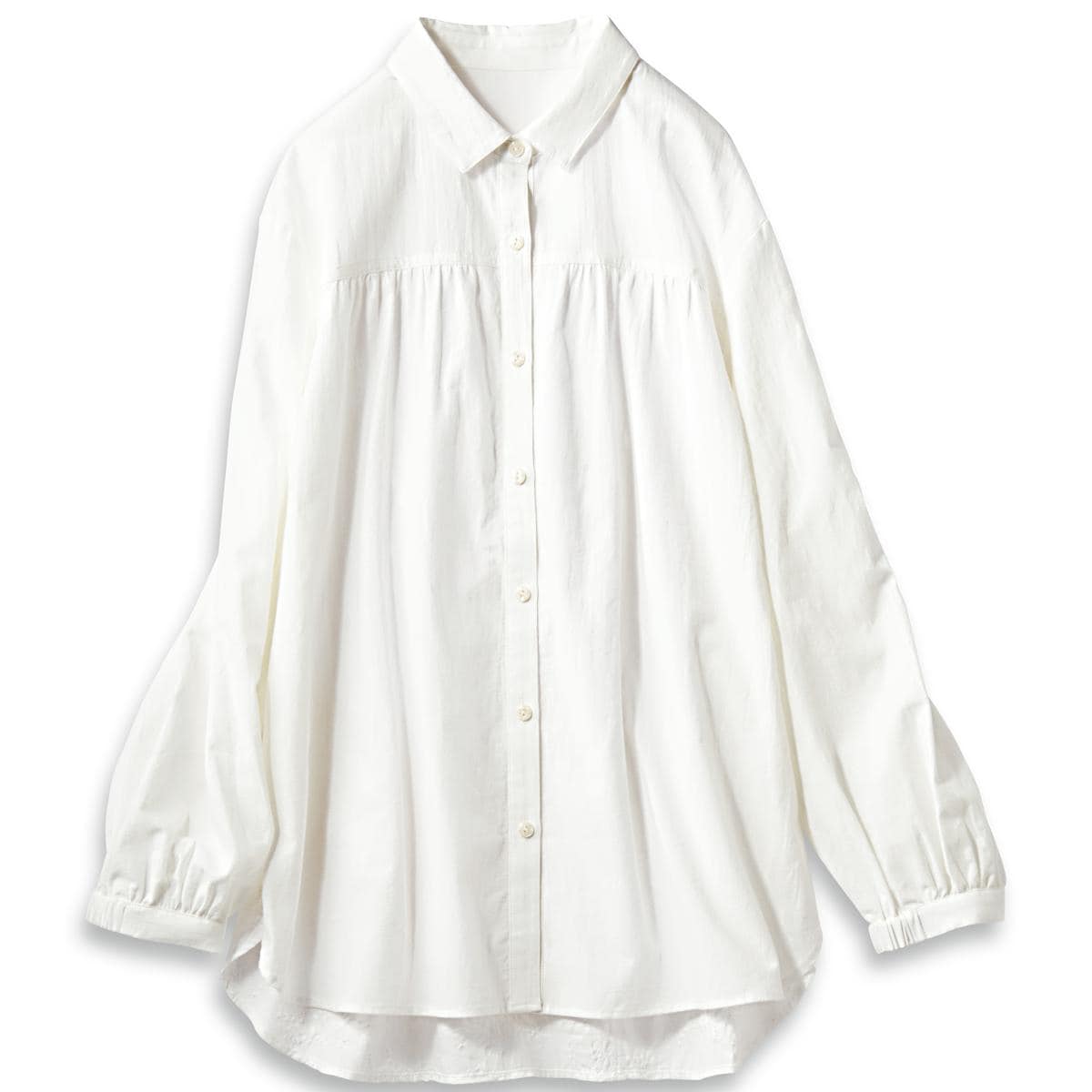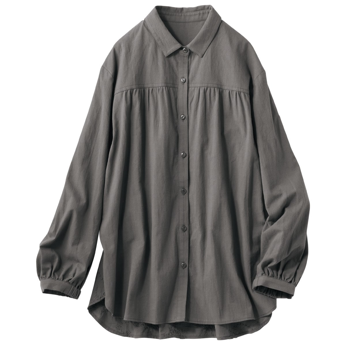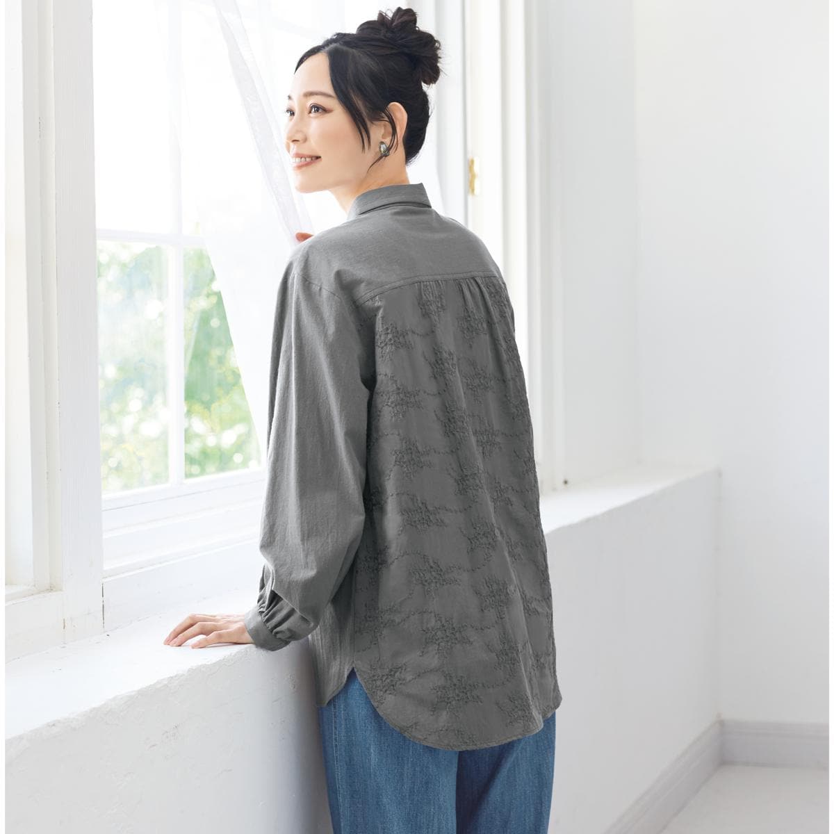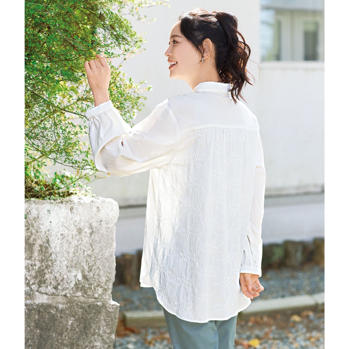 -お買い得ポイント-背面の刺しゅうがおしゃれポイント。ゆったりとしたデザインなので、前を開けて羽織りとしても◎。-デザイン-華やかな刺しゅうの後ろ姿にときめく、柔らかな肌ざわりのブラウスです。後ろ長め丈が嬉しい、安心感のあるデザインです。-素材特徴-綿100 %だからヒヤッとしない!ふわっと柔らかな肌ざわりのワッシャー素材。