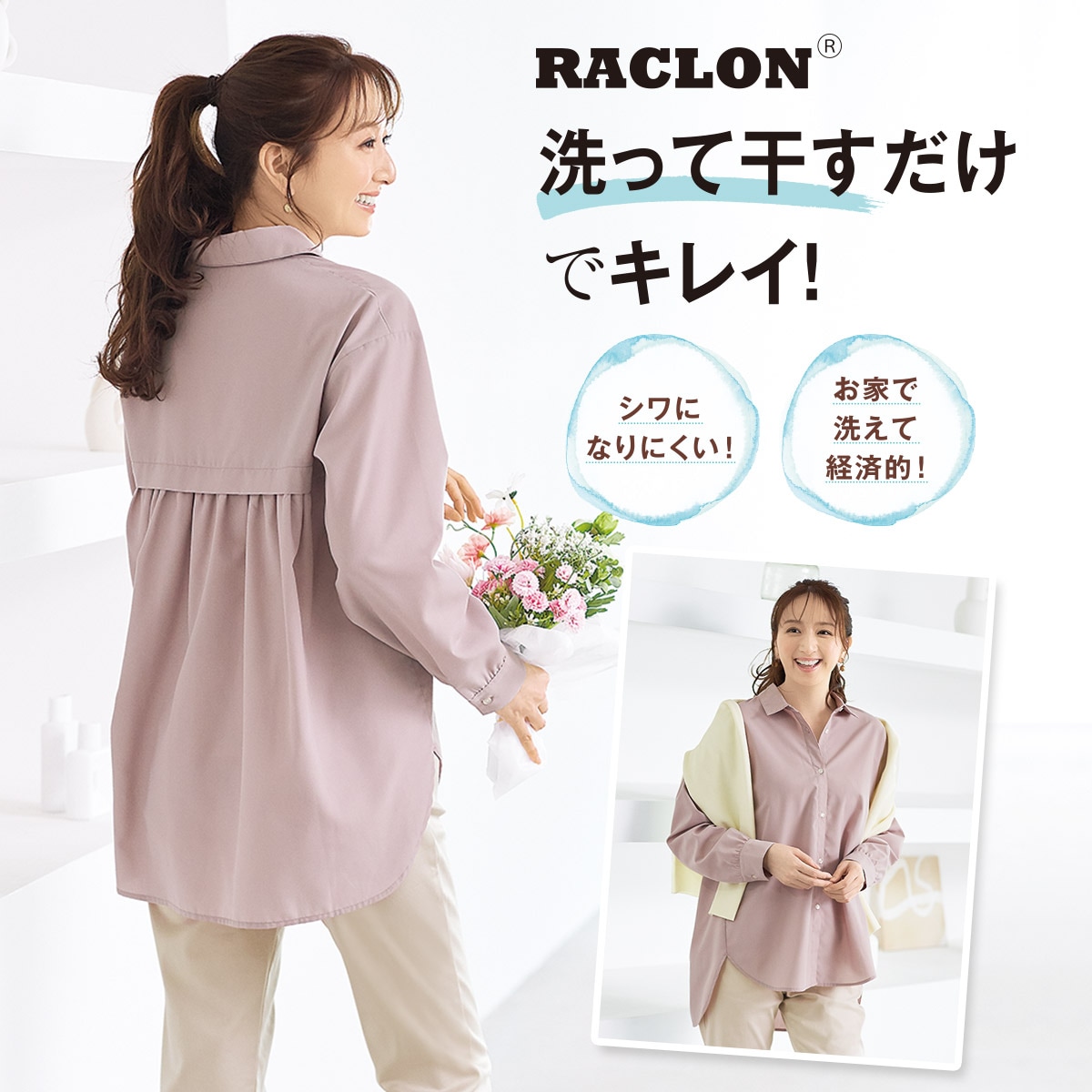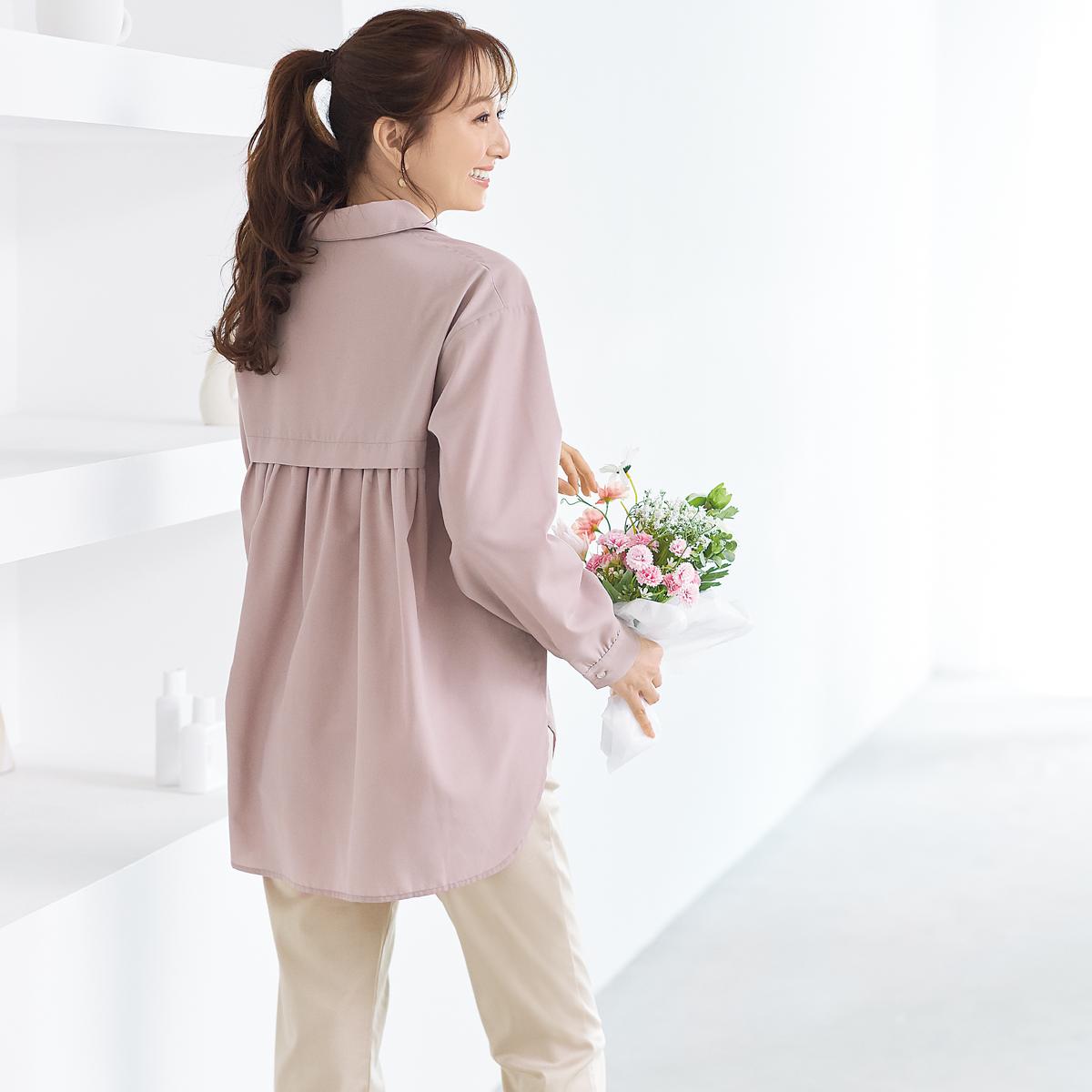 後ろに入ったギャザーデザインが、華やかさをプラス!洗濯してもシワになりにくいイージーケア素材。