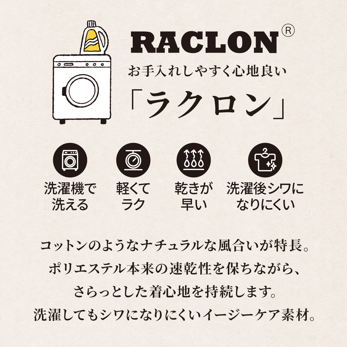 コットンのようなナチュラルな風合いが特長。ポリエステル本来の速乾性を保ちながら、さらっとした着心地を持続します。