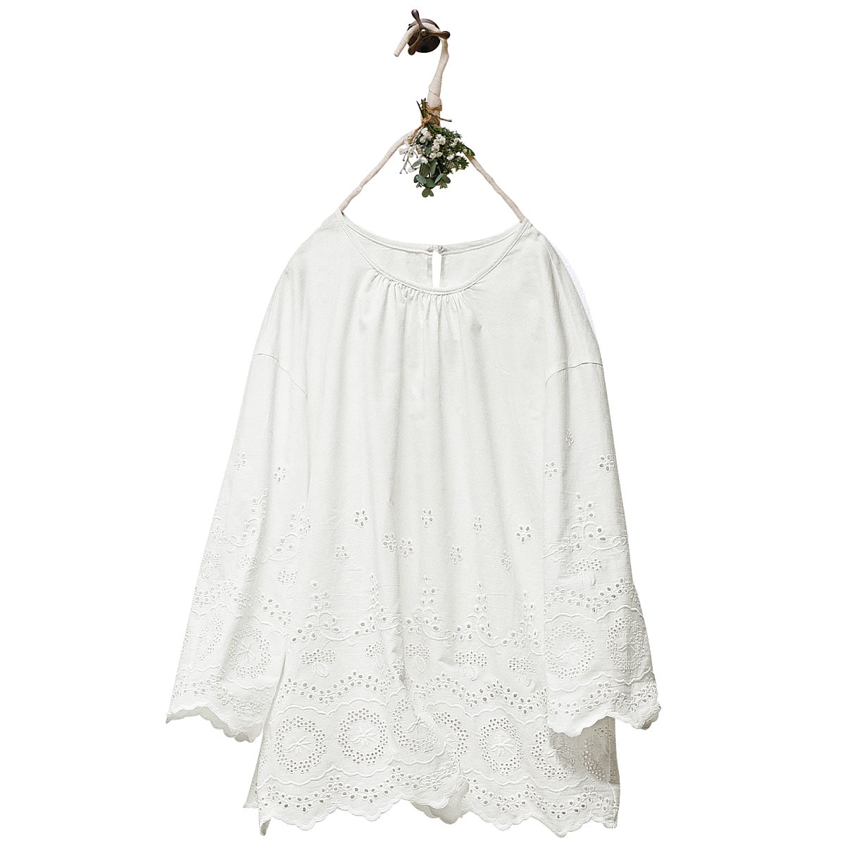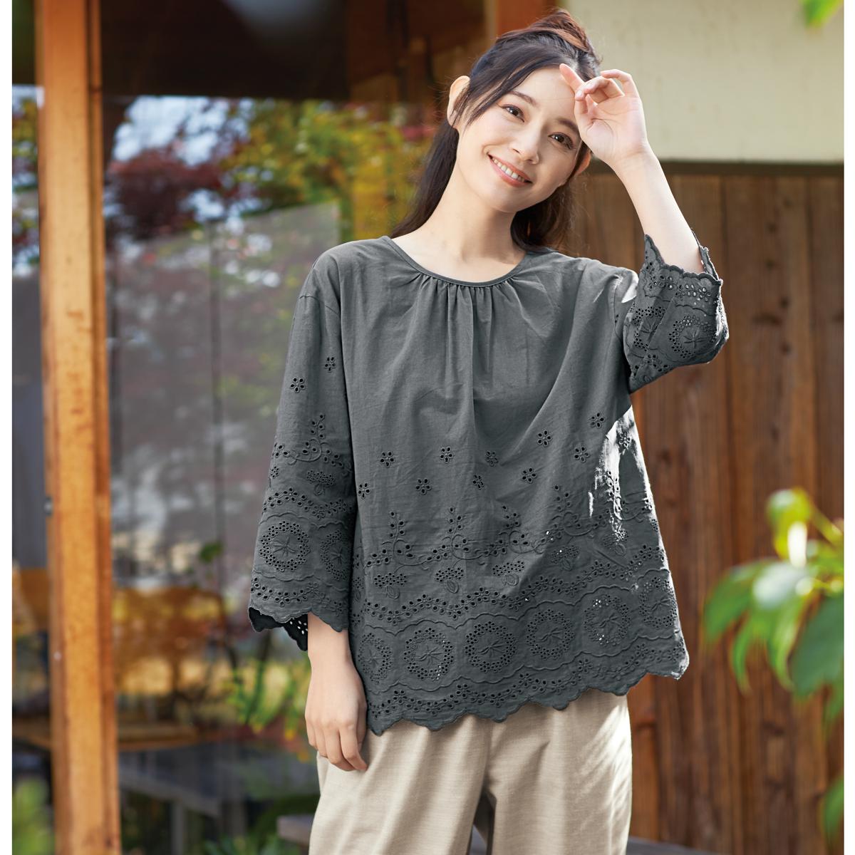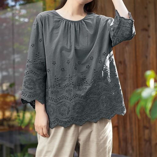 -お買い得ポイント-愛らしい刺しゅうや華やかなレースをあしらい、ニュアンスのある表情に仕立てたコットン100 %ブラウスです。-デザイン-裾に広がる涼しげなスカラップ刺しゅうレースが、洗練ナチュラルな着こなしにぴったり。衿元のギャザーでお顔まわりをやさしい印象に。-素材特徴-肌に馴染む柔らかな風合いが心地いい綿100%素材。