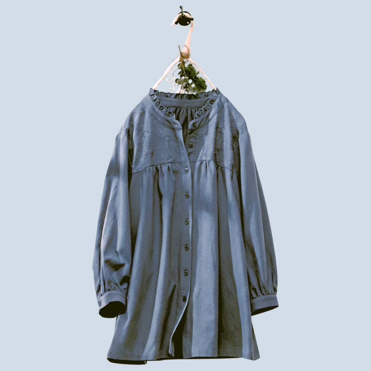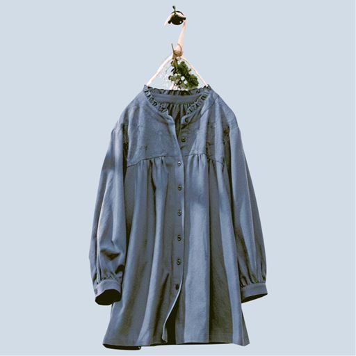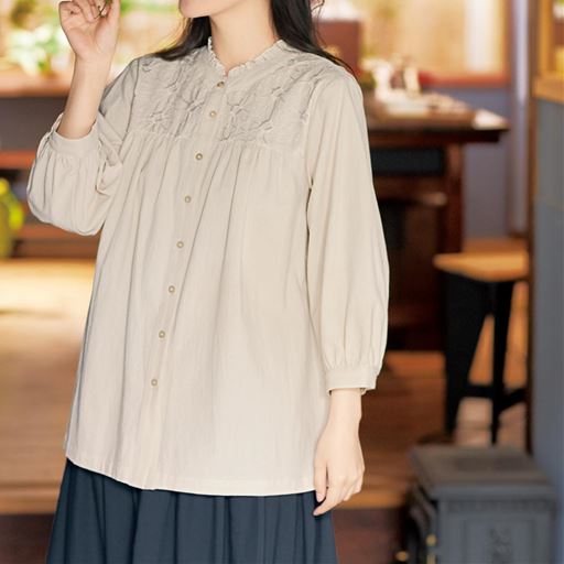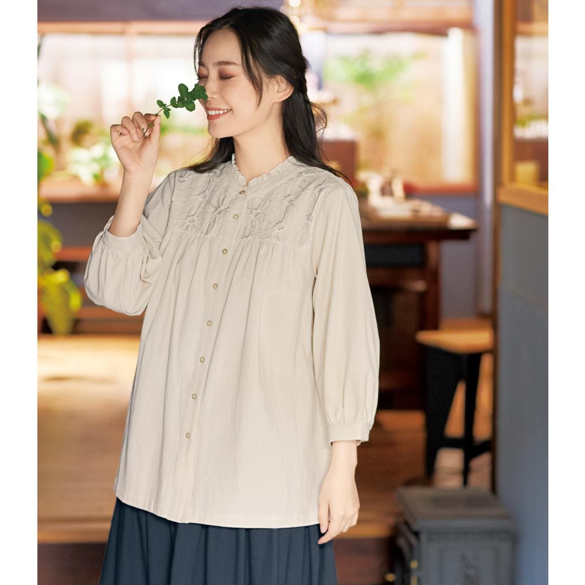 -お買い得ポイント-1枚で顔周りを華やかに見せ、上品で女性らしい印象に。オフィスカジュアルから休日のお出かけまでシーンを問わず着回せるのもうれしい。-デザイン-ヨーク部分の繊細な花柄刺しゅうと衿のフリルが華やか。-素材特徴-肌離れの良いワッシャー素材。