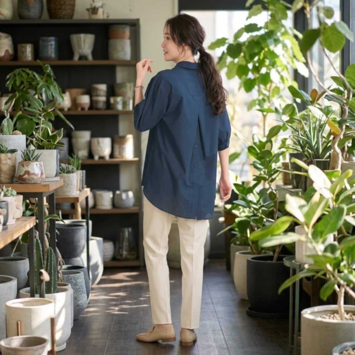「後ろ姿もおしゃれで、手入れも簡単、着心地が良い」という大人の女性向けの機能派シャツです。