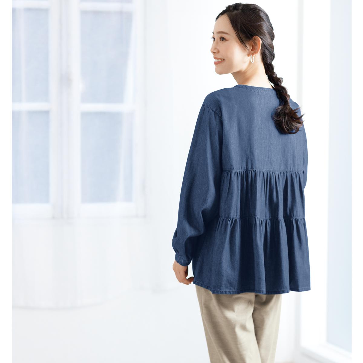 -お買い得ポイント-さりげなく体型をカバーする落ち感で、締め付け感もなくリラックス気分。上品カジュアルな装いに華を添える繊細なディテールに心躍ります。-デザイン-背中側にあしらった程よいボリューム感のティアードデザインが洗練された雰囲気。-素材特徴-やさしい肌ざわりの綿混デニム素材でソフトな着心地です。