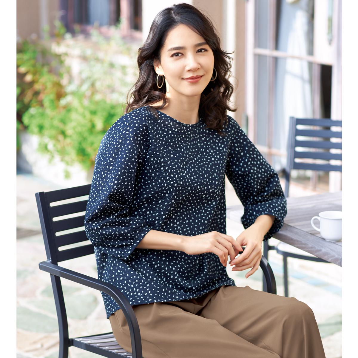 -お買い得ポイント-きちんとしたコーデに相応しい適度なハリと、豊富な色柄が着こなしを品良く華やかに彩ります。-デザイン-ふんわりしながらも広がりすぎないシルエットが美しい佇まいへ誘います。-素材特徴-独特な凹凸でシボ感のある綿100%素材が、風通しの良さと爽やかな肌触りを兼ね備えて軽やかな着心地。
