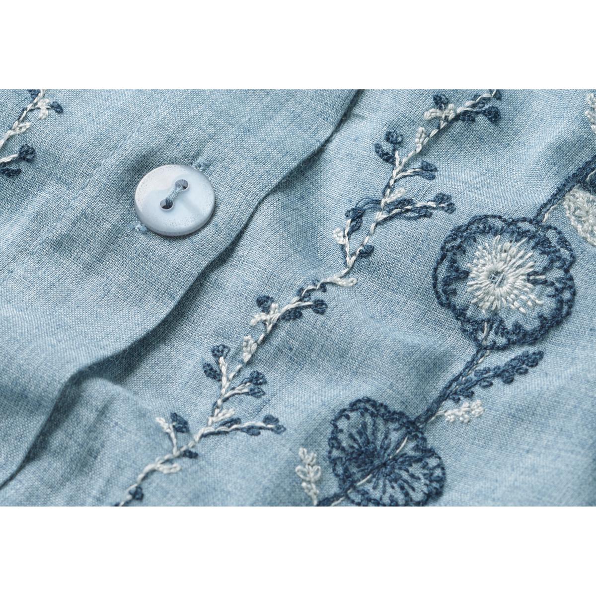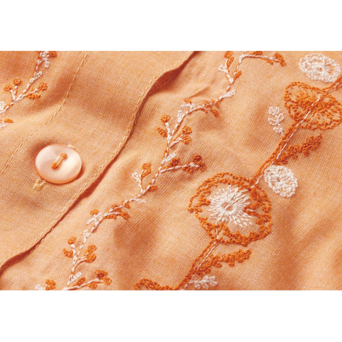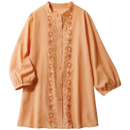 -お買い得ポイント-花柄が縦に並ぶことで、横幅のボリュームを抑え、全体的にスマートな印象を与えます。-デザイン-フリル衿と縦ラインの花柄刺しゅうが華やぎを添えます。-素材特徴-綿混素材。柔らかな風合いが軽やかで、着ていてラクチン。