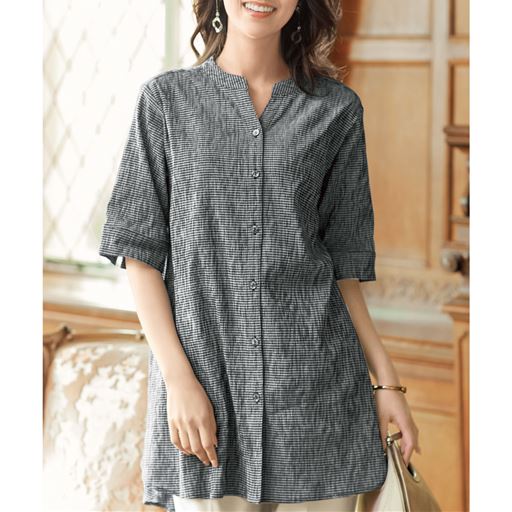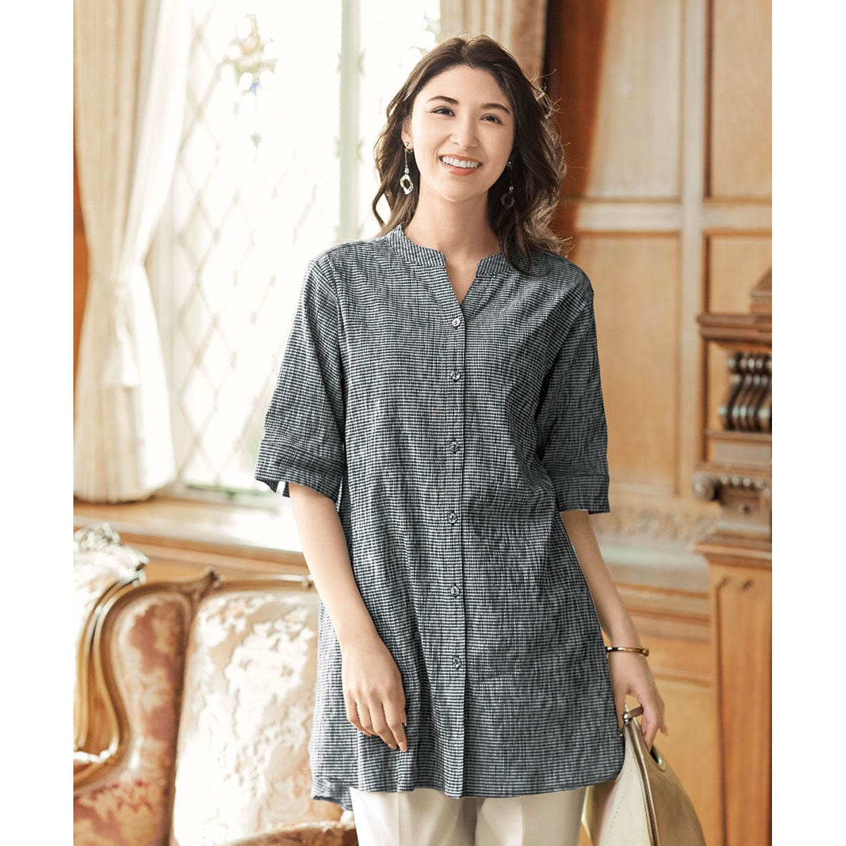 -お買い得ポイント-襟元がボタンのないV字型になっているため、頭からすっぽりとかぶって簡単に着用でき、首元を涼しくすっきりと見せる上品な大人カジュアルです。-デザイン-前後差のある丈が腰まわりをカバーして華奢な印象。顔まわりをシャープに見せるスキッパー衿が涼やか。-素材特徴-強い撚りをかけたヨコ糸によって独特なシボ感を生み出し、風通しが良く肌にまとわりつきにくい。優れた吸湿性を持ち、爽快感のあるさらりとした着心地で涼しい夏を堪能できます。