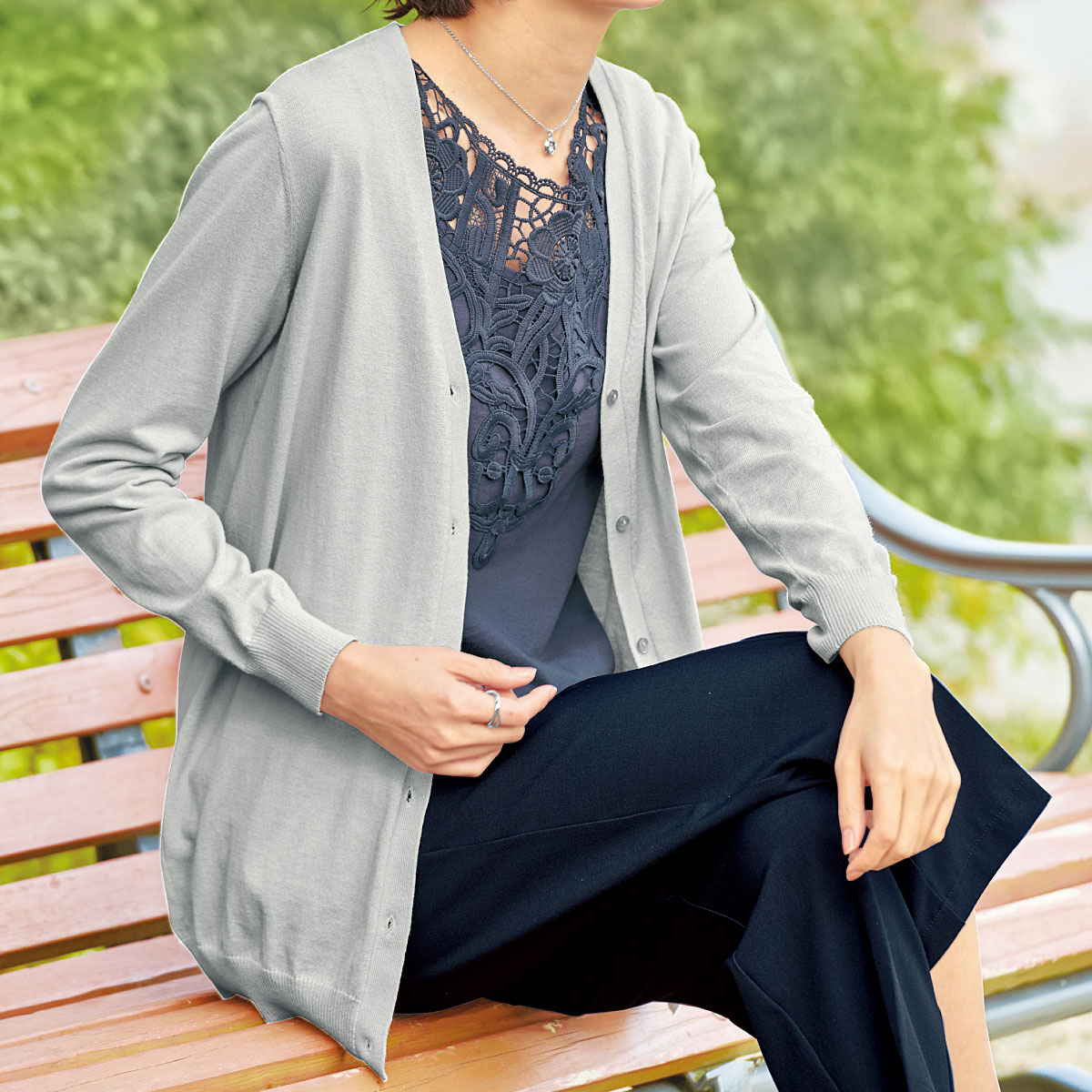 オフホワイトと一緒にコチラのブラックも大人買いしたんですが、モチロンこのカラーもモノ凄く素敵です!サイズもいつもよりワンサイズ小さめのSサイズがピッタリで、羽織りのインに色違いゲットして大成功~。とにかくグルッと付いてコットンレースが高見えするので、何歳になっても着られるし色違いで何枚でもほしいくらいですネ(笑)