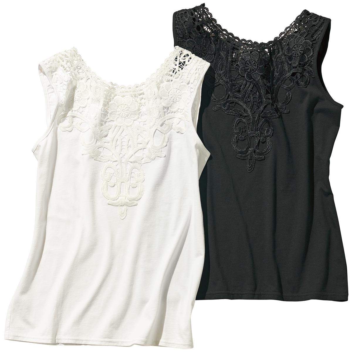 胸元の華やぎレースが存在感のあるエレガントを印象づけるタンクトップ。
